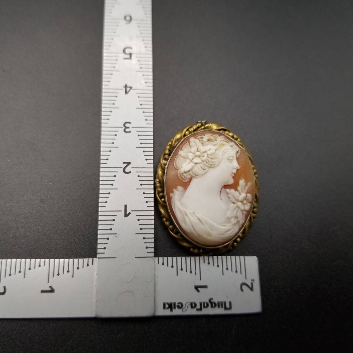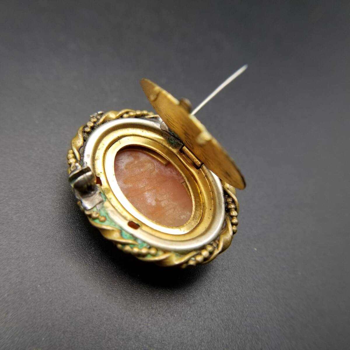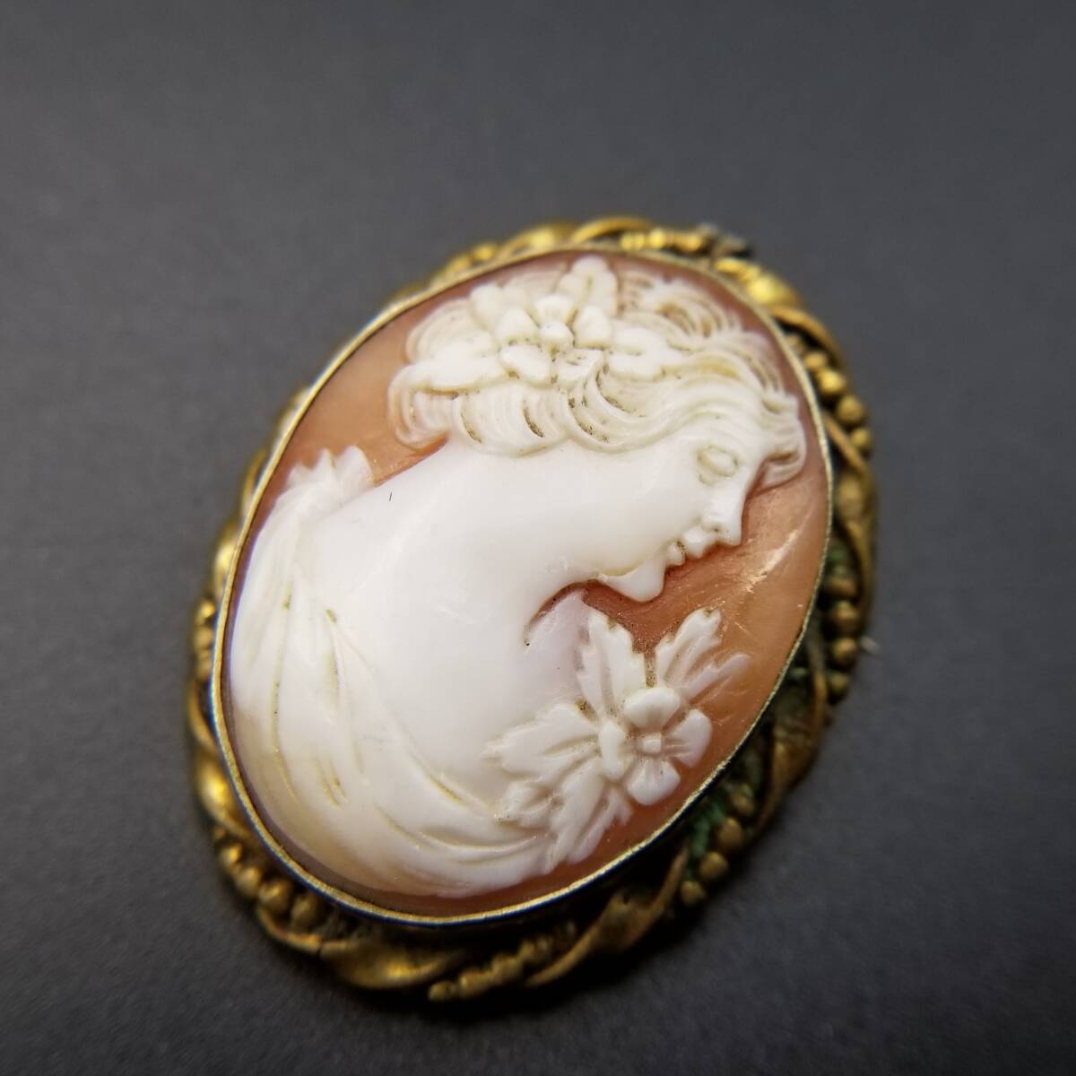 ドレスを着た女性の横顔 シェルカメオ ヴィンテージ ブローチ ケーブルリム 装飾美 オーバルフレーム レトロ 上品 エレガント ロケット調 Y22-G