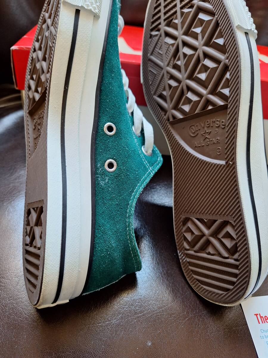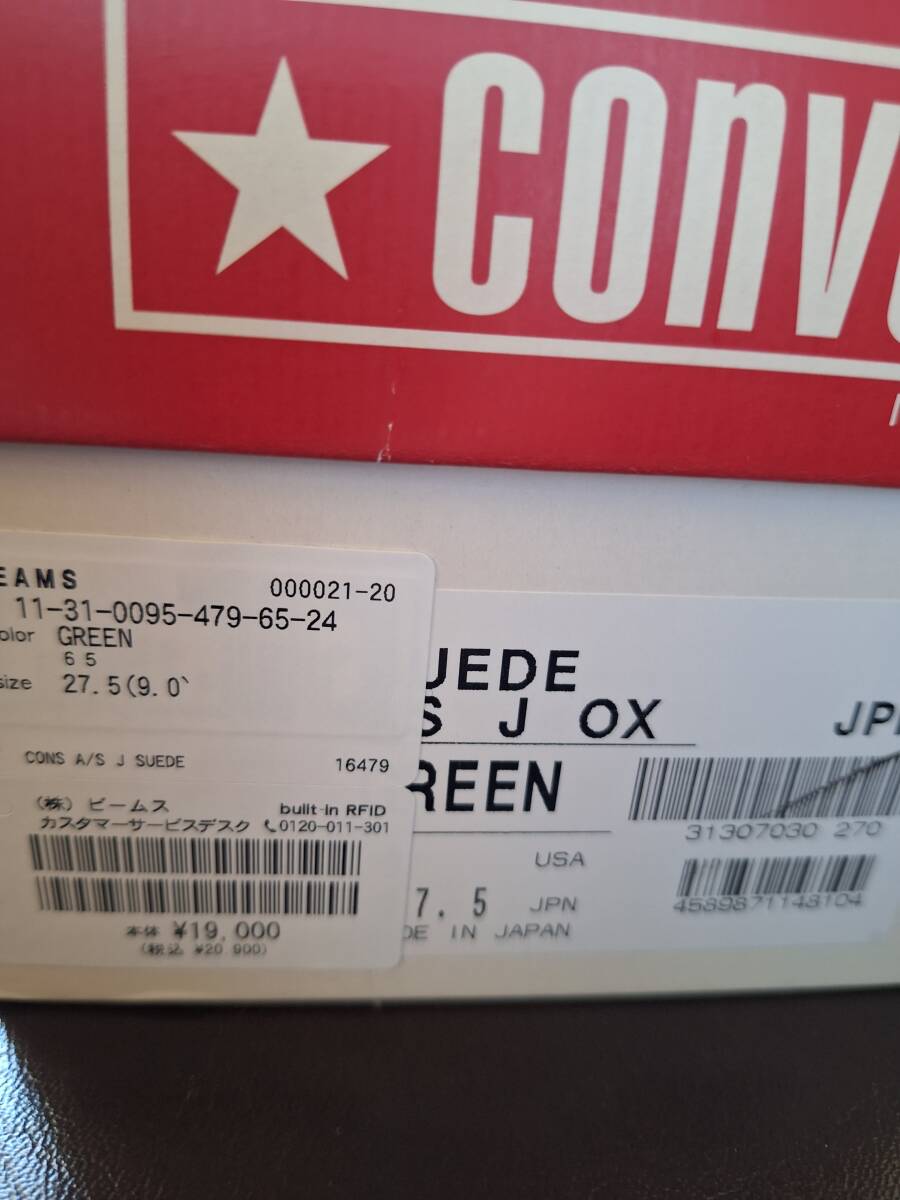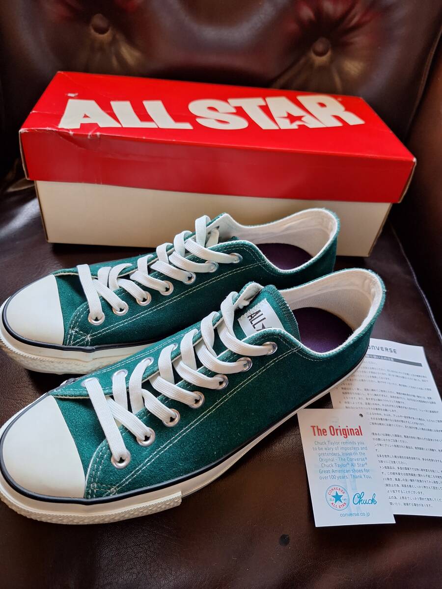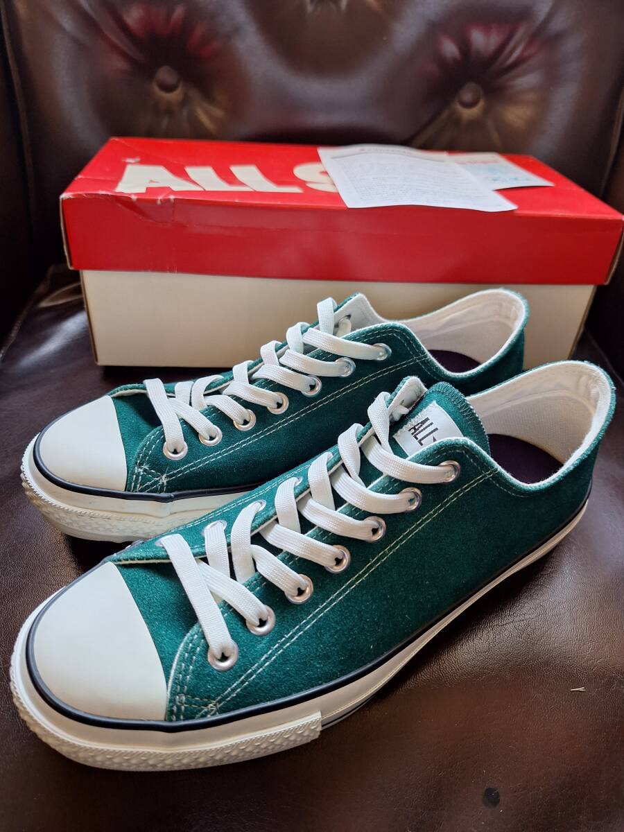 コンバーススウェード緑日本製27.5cmになります。1回短時間着用美品です。スウェード素材は色落ちしやすいので紐を別に使用しています。買った時からうっすら色落ちが紐にみられていました。移動は車なので踵の減りもなくキレイです。ゆうパック着払いにて発送させて頂けたらと思います。