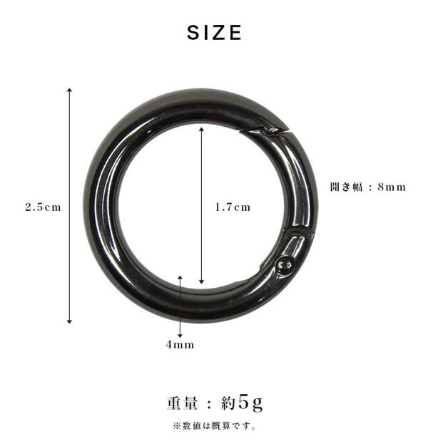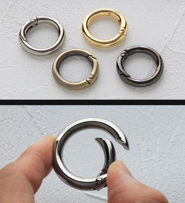 この商品は、バネ式の開閉で簡単に使える便利な丸カラビナ(中)の3個セットです。カバン、財布、ポーチやベルトループ等に取り付けたり、 又キーホルダーとして鍵をまとめたりと工夫次第で様々な用途に活用できます。