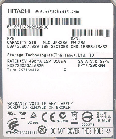 | HITACHI製HDD HDS722020ALA330 2TB SATA300 7200rpm 5000~6000時間以内 | |