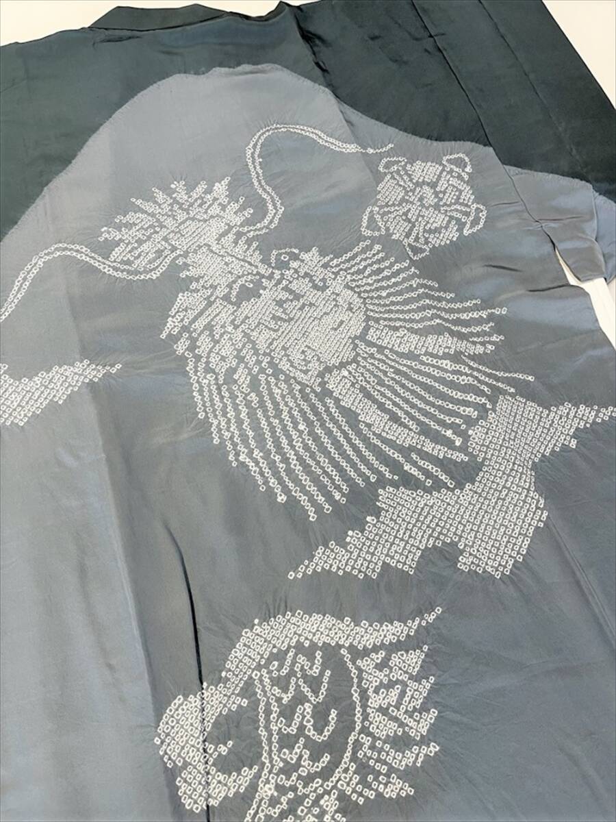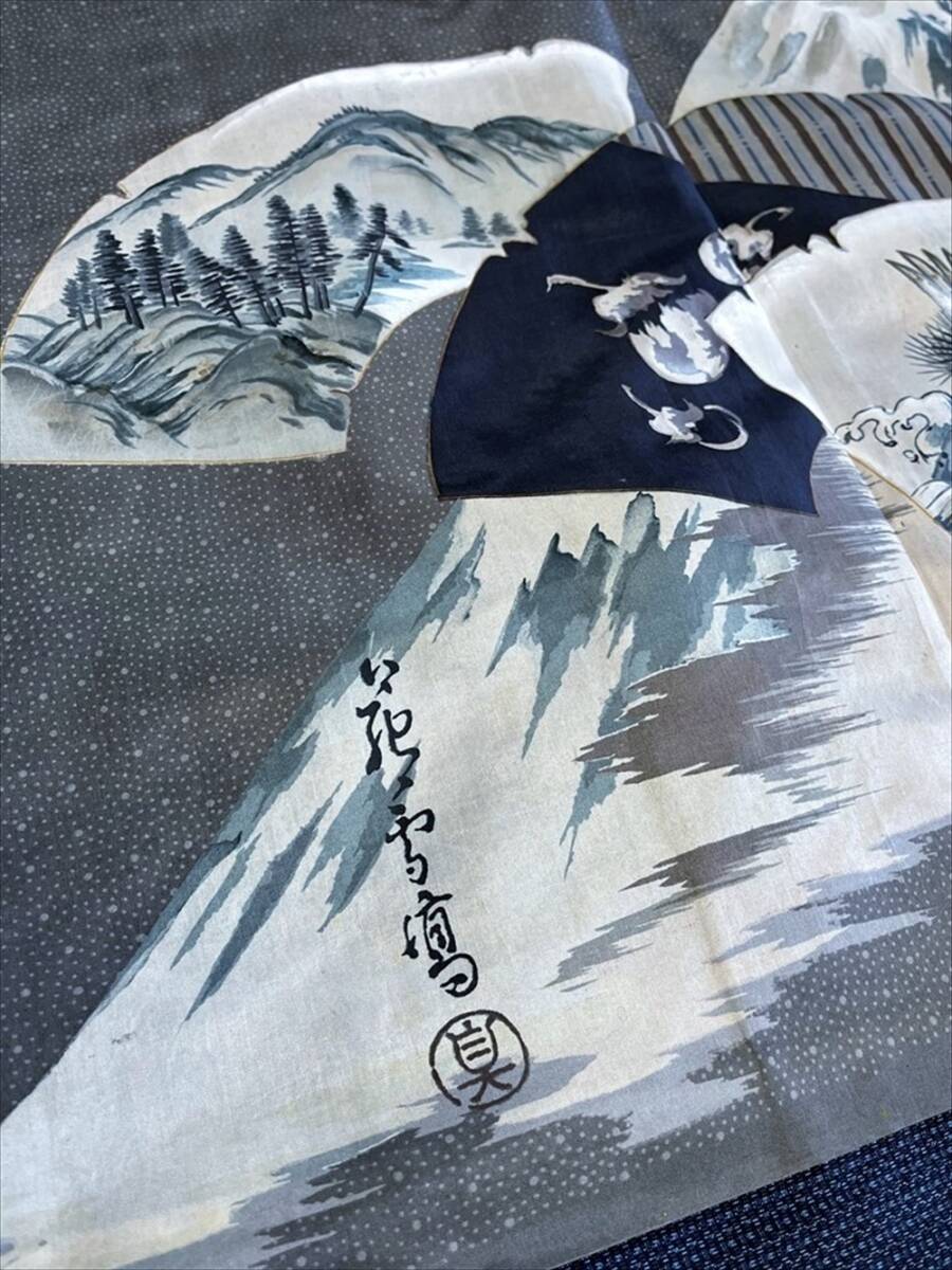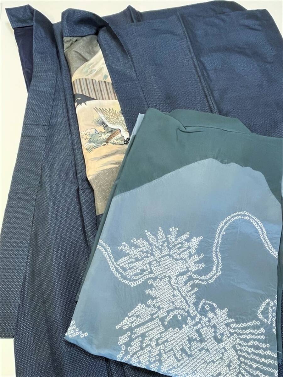 花とら●リサイクル着物 男物 アンサンブル 紺系 長襦袢付き リメイク 素材   250405