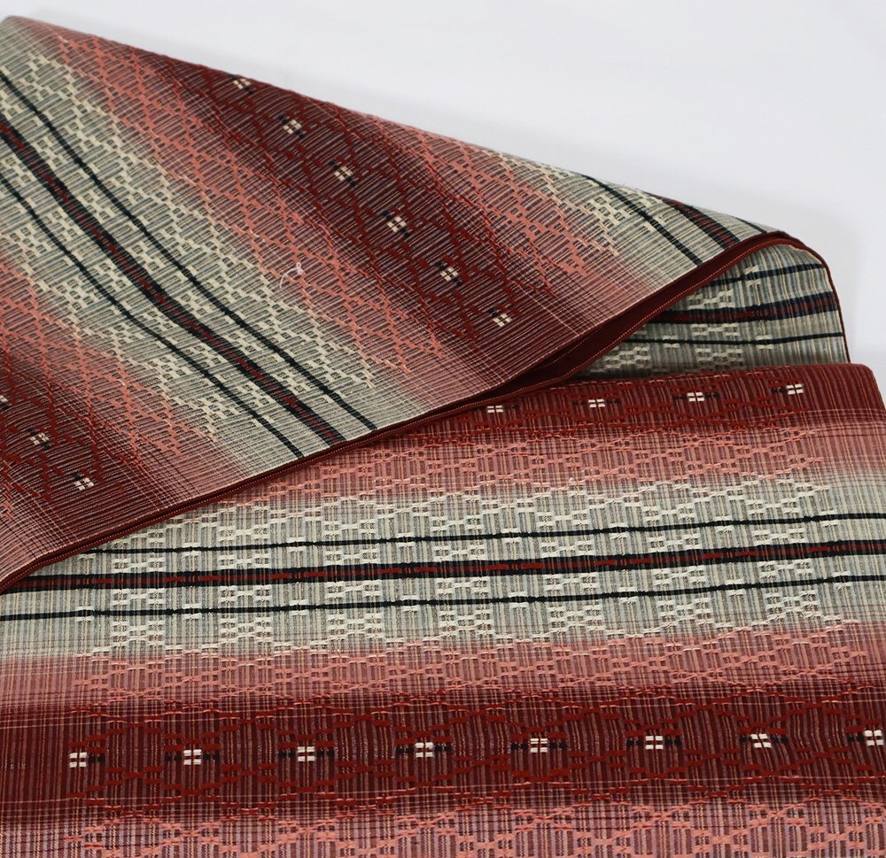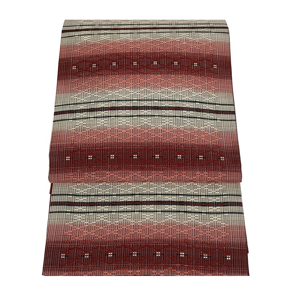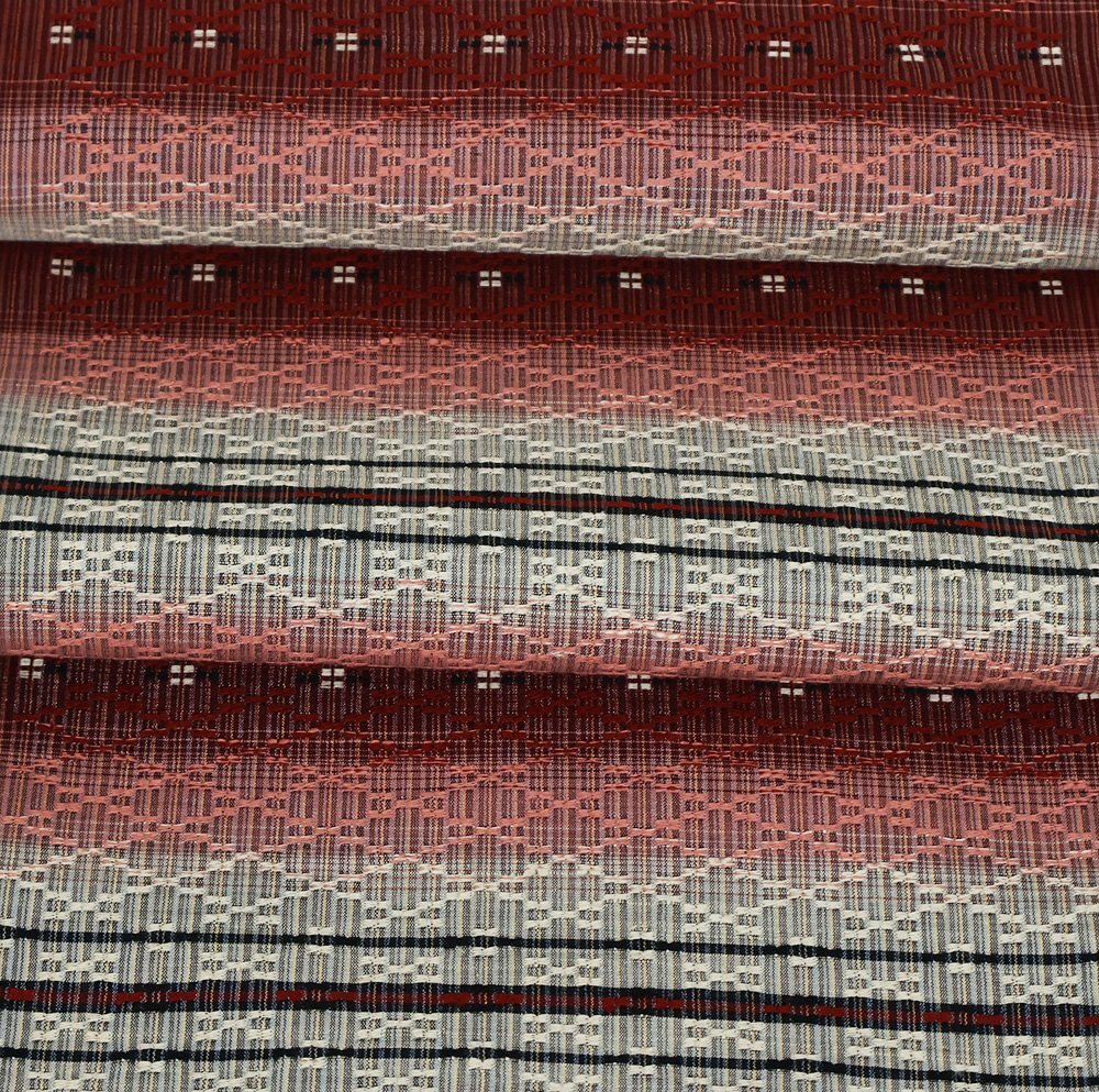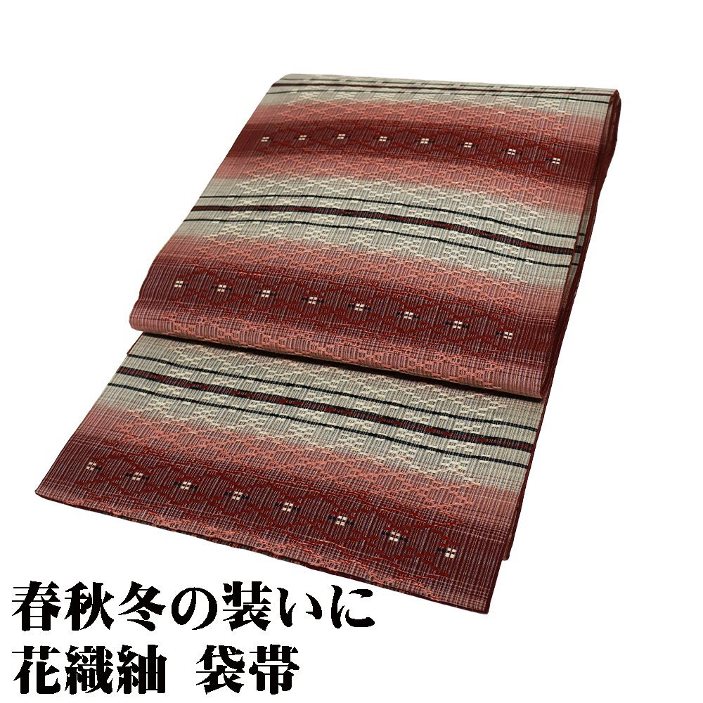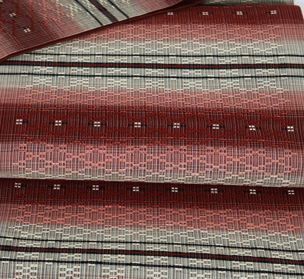 | 花織紬 袋帯 赤紫・薄緑・グレー地地 花織 全通 裏地:小豆色・赤・緑・薄茶・縞 未使用品 仕立て上がり |