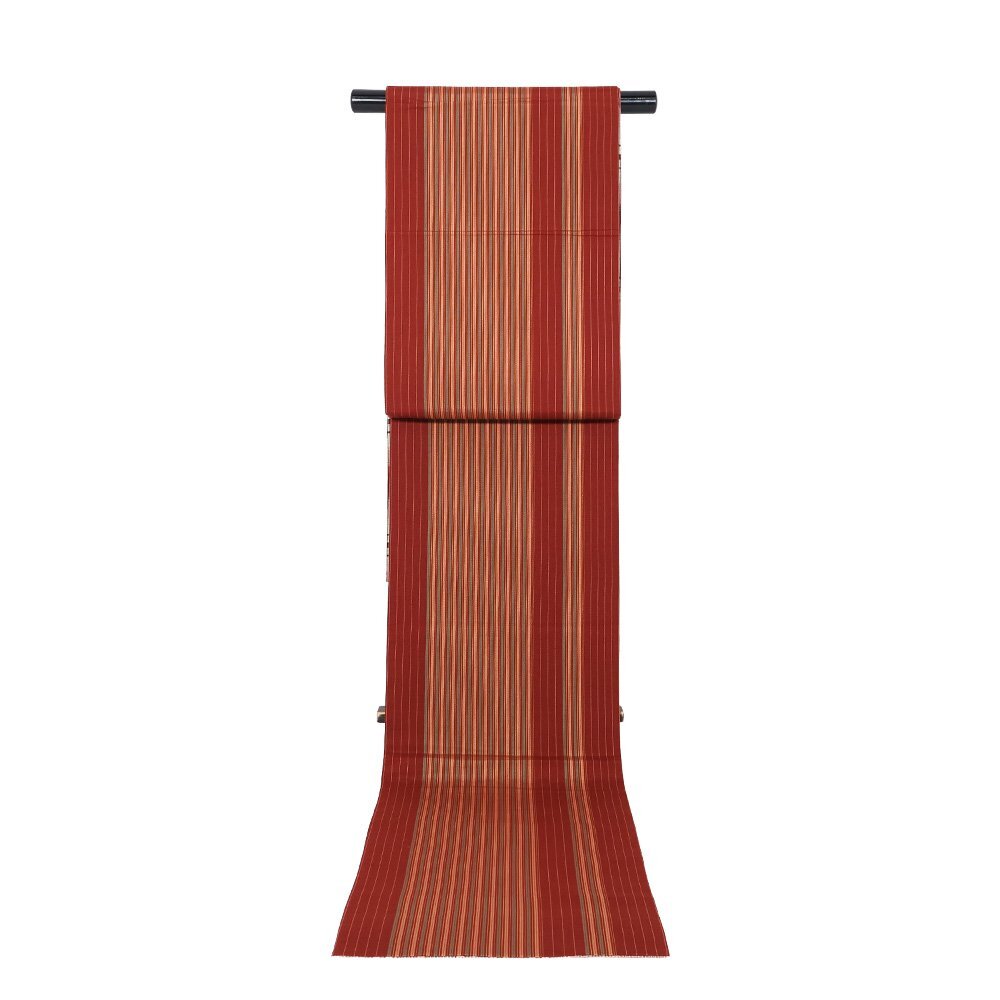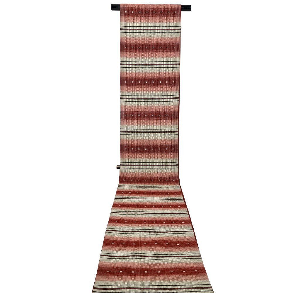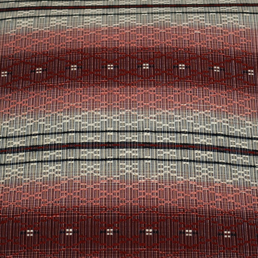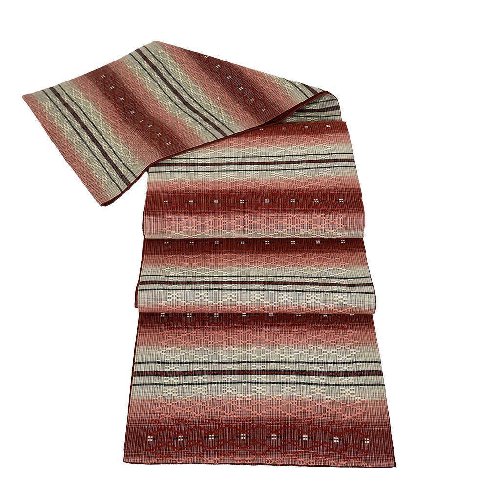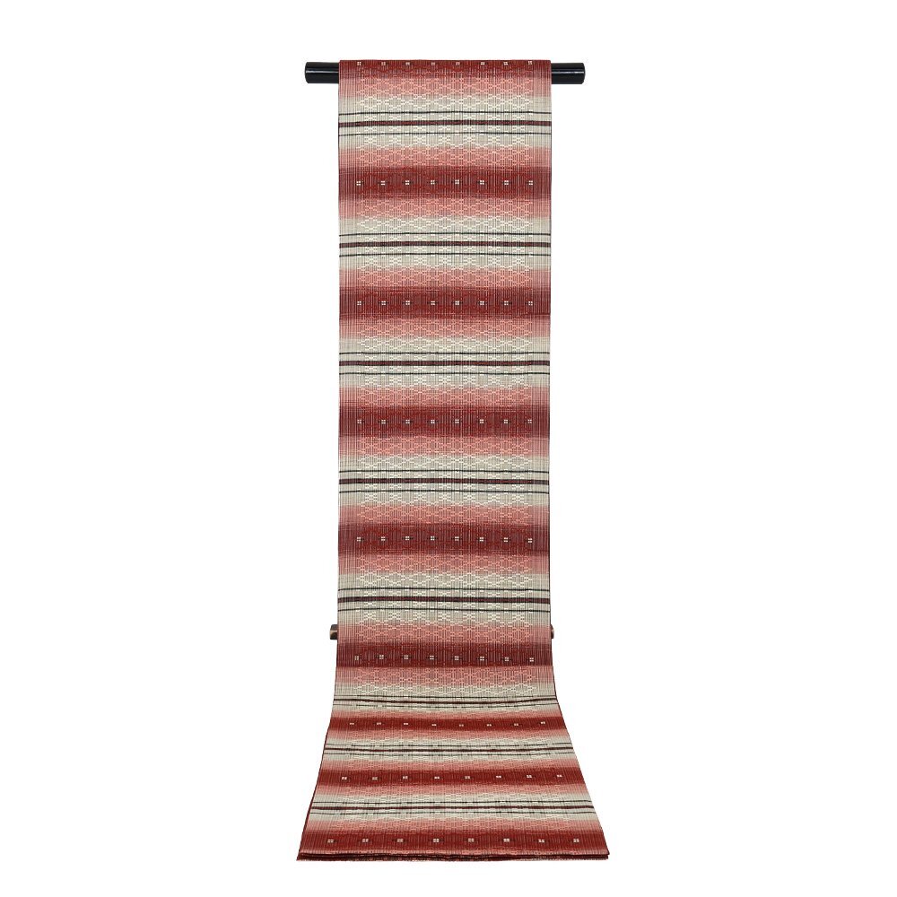 | 花織紬 袋帯 赤紫・薄緑・グレー地地 花織 全通 裏地:小豆色・赤・緑・薄茶・縞 未使用品 仕立て上がり |