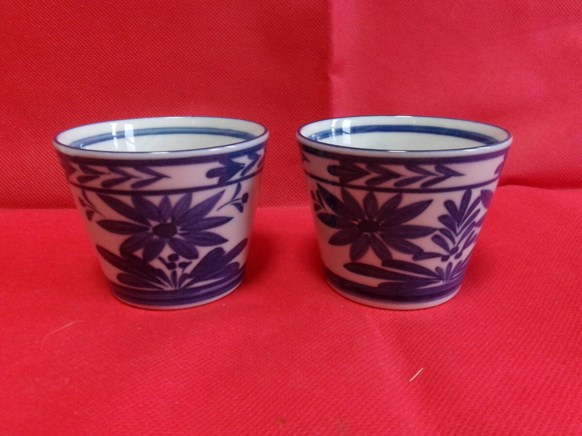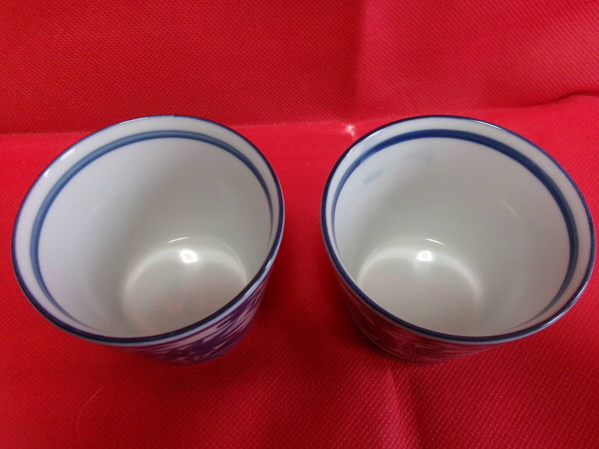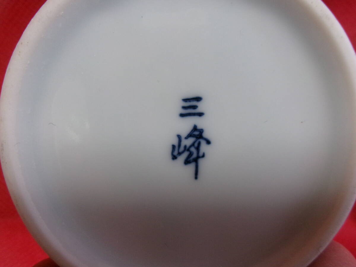 三峰作 そば猪口2個セット  口径約8.5  高さ約6.8  写真のように1個内側に染付の色がうすく付いているような感じです