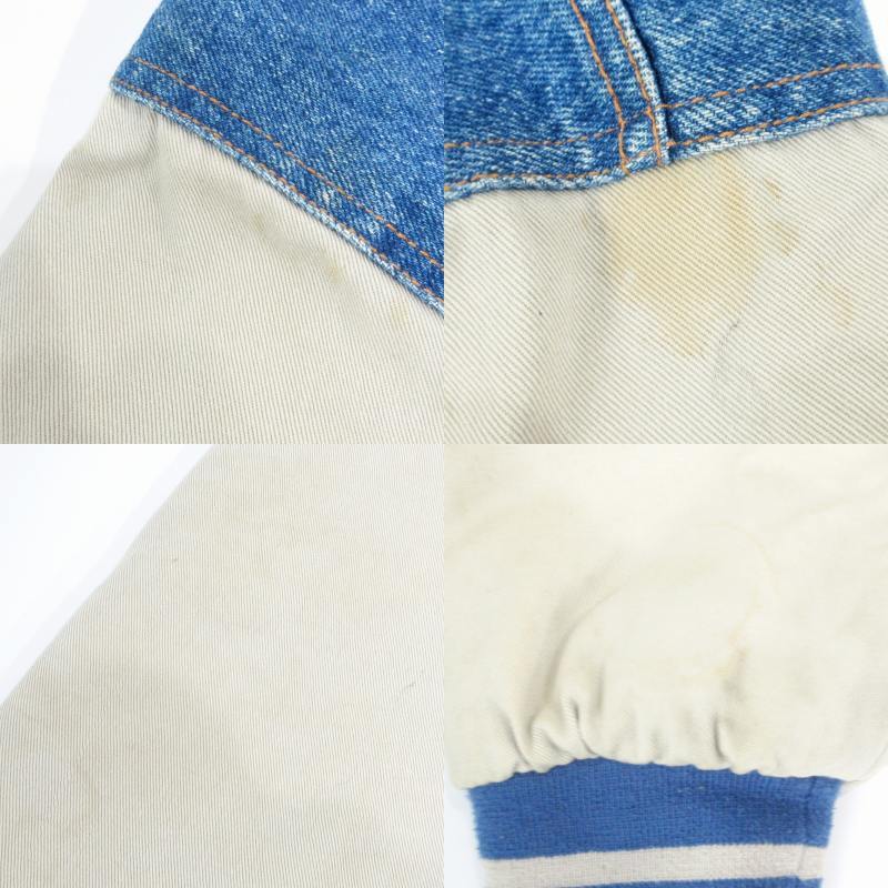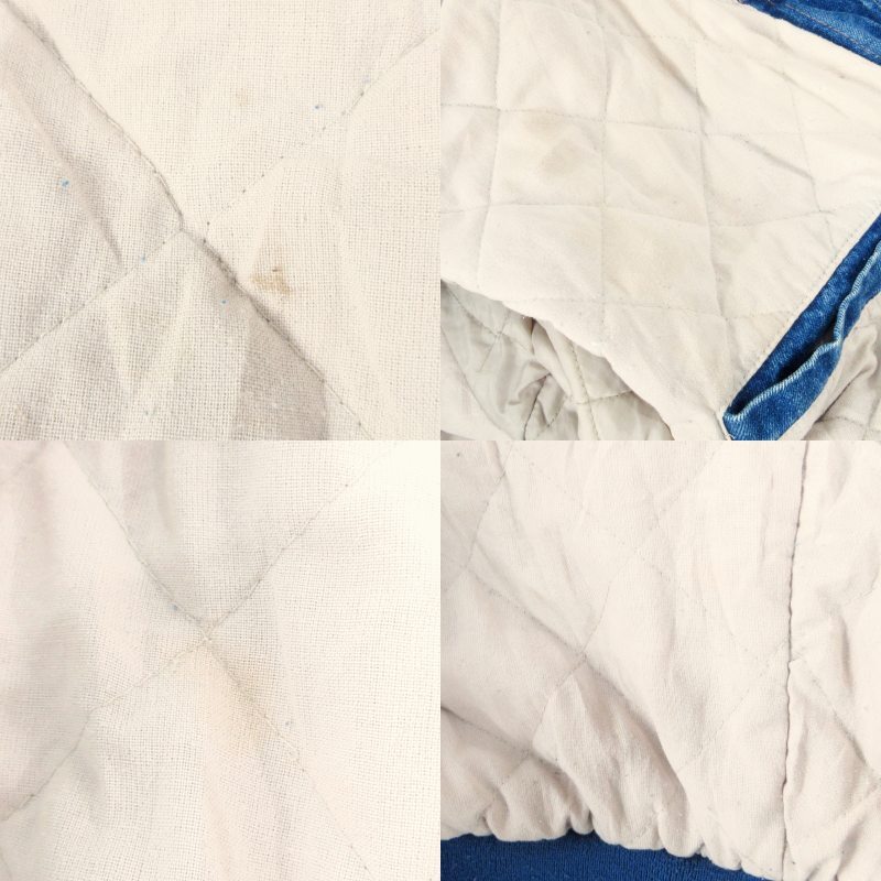 【状態】・左肩後ろに0.5cmほどの穴(貫通はしていません。) ・デニム生地に擦れ、色落ち ・両袖全体に汚れ、変色 ・裏地に擦れや毛玉、複数の汚れ ※使用感の他、上記のようなダメージがある中古品です。掲載写真や記載内容をご確認いただき、ご理解の上ご購入ください。