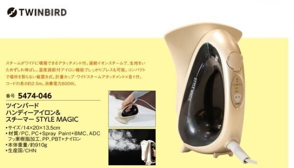 | 【商品番号】 5474-046 【商 品 名】 ツインバード ハンディーアイロン &スチーマー STYLE MAGIC |