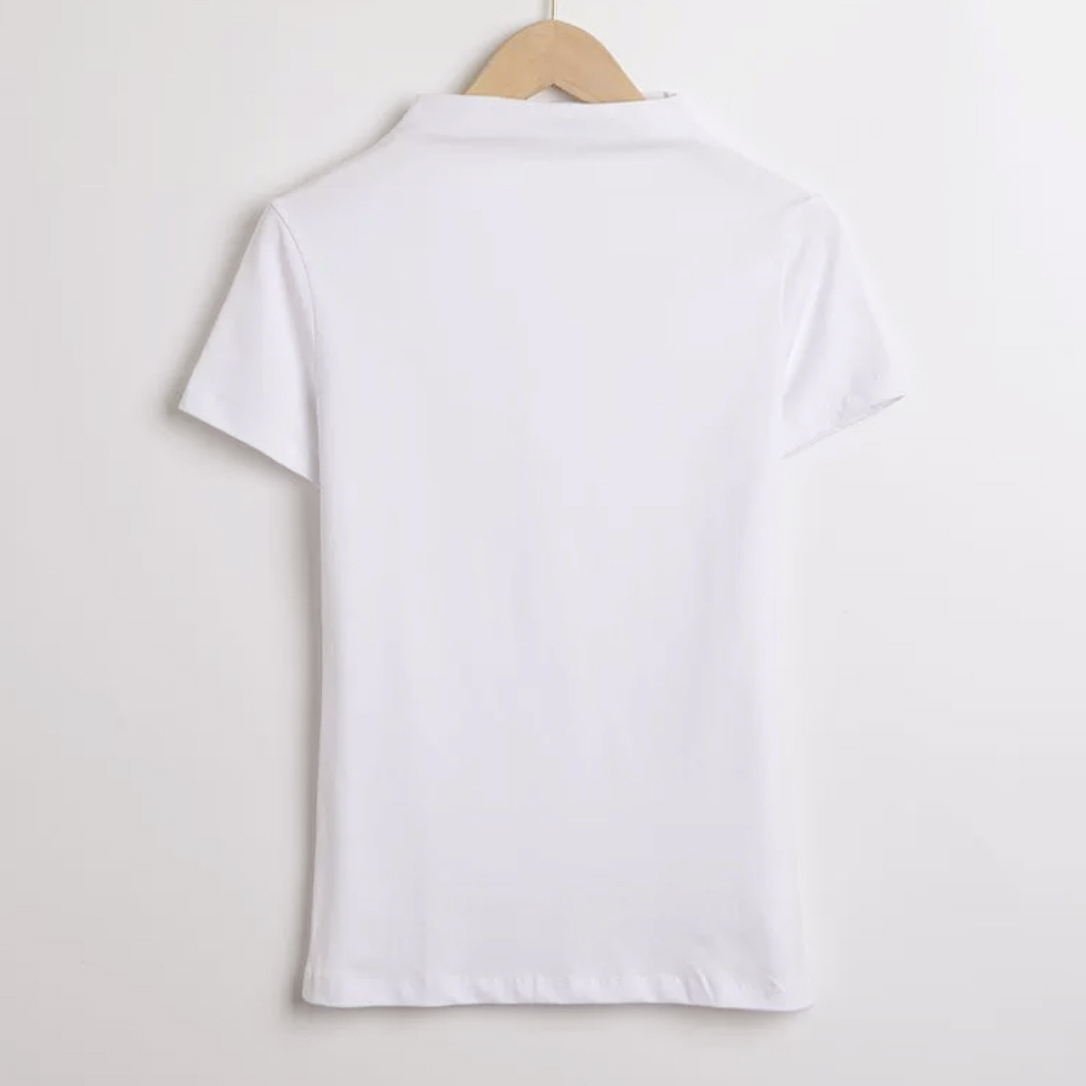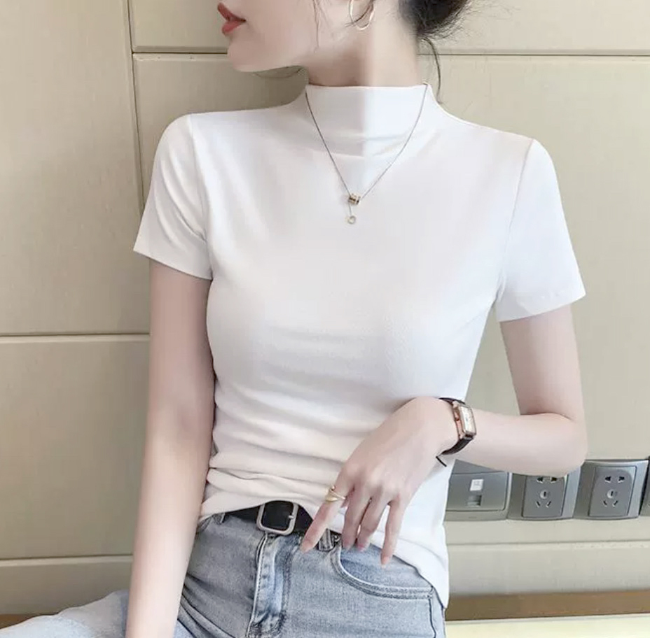 新品 ホワイト ハイネック 半袖 ストレッチ カットソー モックネック free16