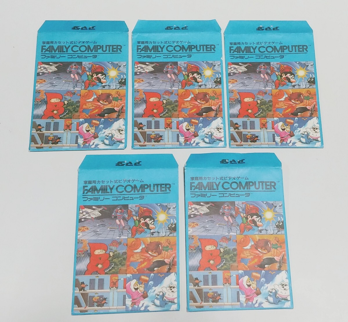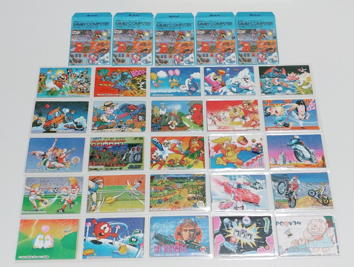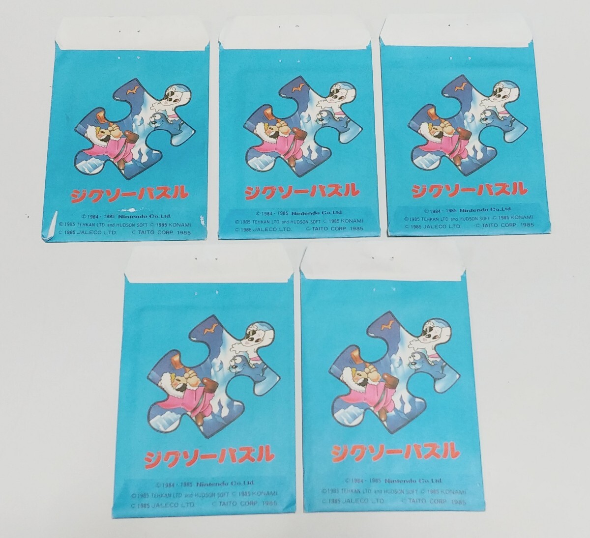 駄菓子屋さんで販売されていたアマダのファミコンミニジグソーパズル25種類と紙袋5枚セットです。