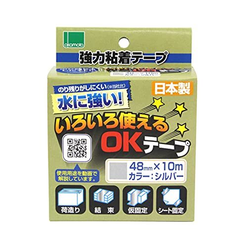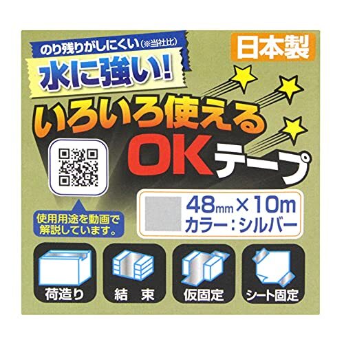 ・グレー 48mmx10M OKT48-S・補修作業に求められる高い粘着性と、作業効率性を考えたテープです。・巾:48mm・長さ:10m・色:シルバー・基材:ポリエステル、粘着剤:天然ゴム系説明 水に強く、梱包から仮止めまでいろいろな用途に使えるテープ 【用途】 荷造り、結束、仮固定、水もれ・ヒビ割れの一時的な補修 【特徴】 ・耐水性に優れたポリエステル製の基材を使用 ・特殊配合の粘着剤により、粘着力が強く、糊残りも少ない ・手で簡単に切れるので、作業効率がアップ ・油性インクで字が書ける 【注意事項】 ※用途以外の使用はご遠慮ください。 ※テープの粘着剤は高温多湿に弱い為保管の際はご注意ください。 ※高温の場所で放置致しますと粘着剤が変質し、糊残りの原因となる場合がございますのでご注意ください。