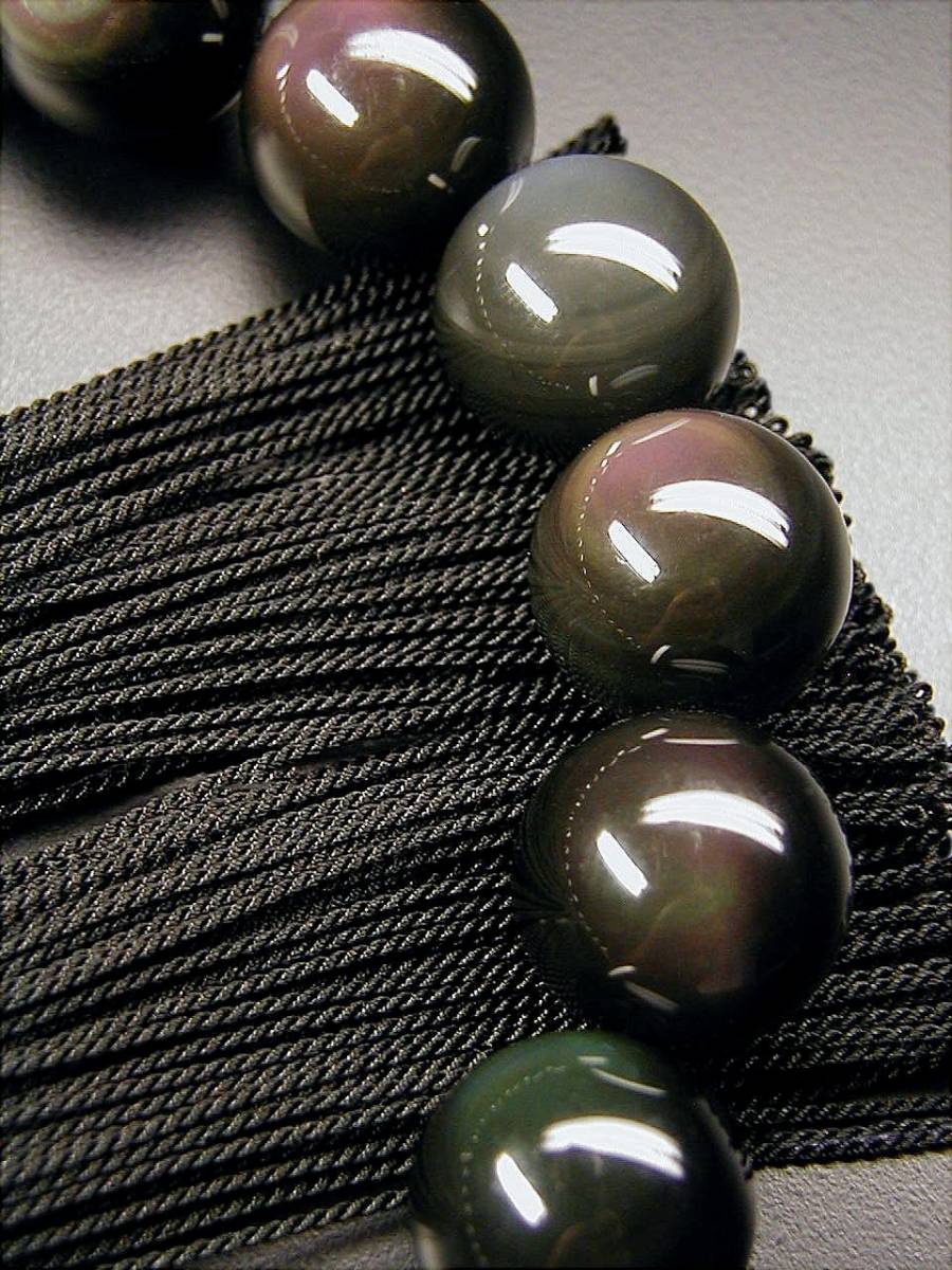 本品に使用されている珠玉は、当社が購入した天然AAA級最高級品質のレインボーオブシディアン黒曜石原材を日本工芸美術品総合会社にてオーダー加工した珠玉です!加工の質は、非常に精美です!本品は、日本で製作された数珠です。品質は、現在、玉器市場において最高級の品です!収蔵品ですので、現在出品中の数珠の品は、すべて未使用品です。