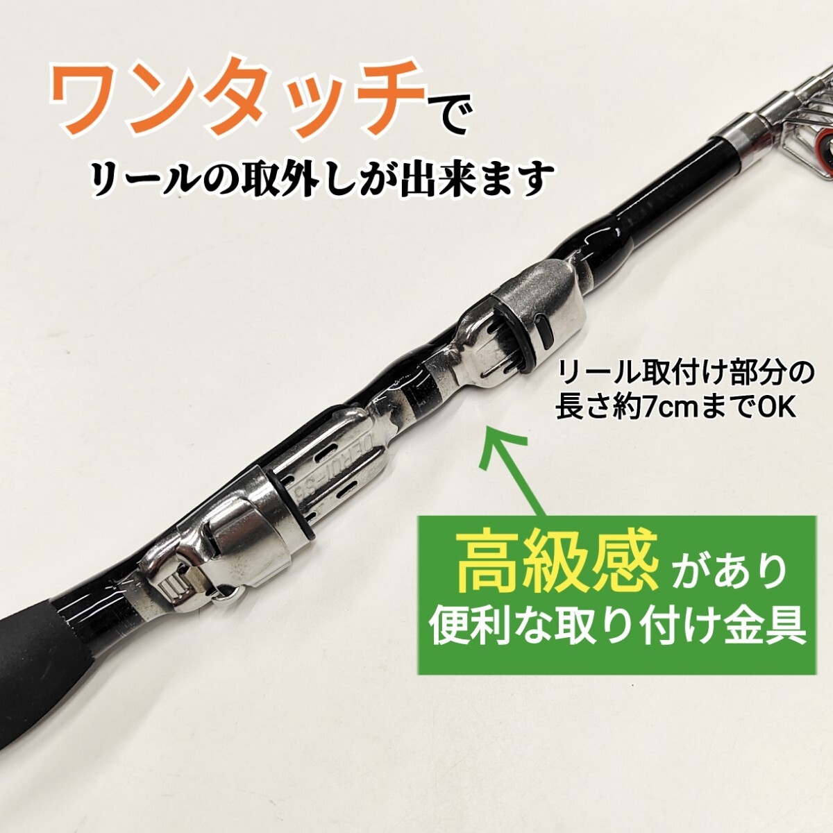 ●リールはワンタッチで取付けが出来、リール取付け部分が約7cmまでの幅に入ればスピニングリールもベイトリールも取付け出来ます。