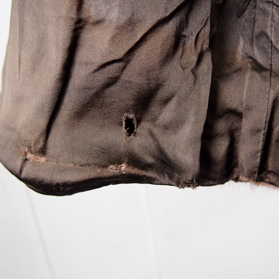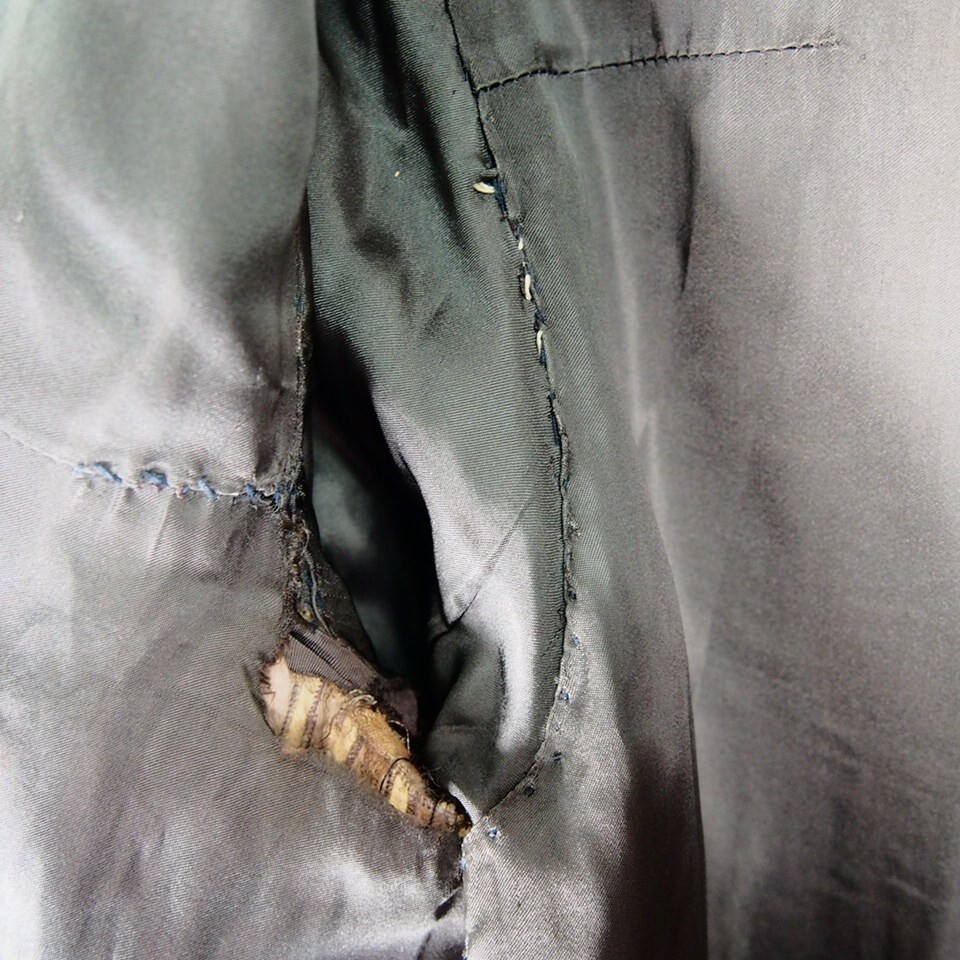 首元裏地や裾裏地、前立て裏地等所々に擦れやホツレ、裂けあり、脇裏地に裂けとリペア痕がございます。
