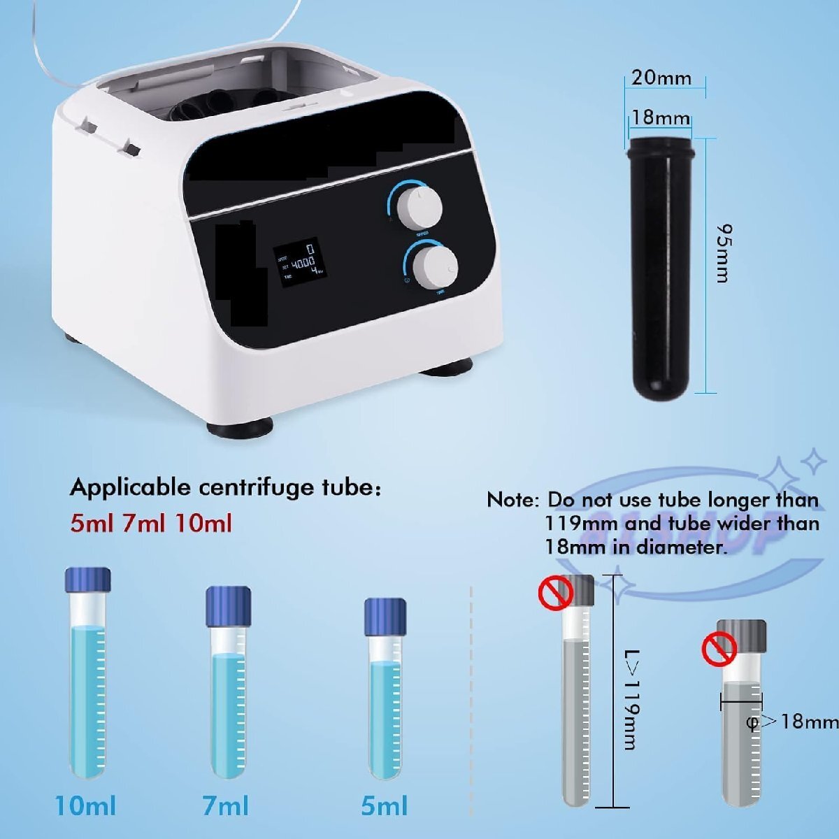 多用途なチューブ互換性: 5ml/7ml/10ml 遠心分離管および 2ml/5ml/7ml/10ml 採血管に適した内蔵遠心分離機により、この電動遠心分離機は幅広い種類の試験管をサポートします。 注: 119mm を超える長さおよび 18mm を超える幅のチューブには互換性がありません。