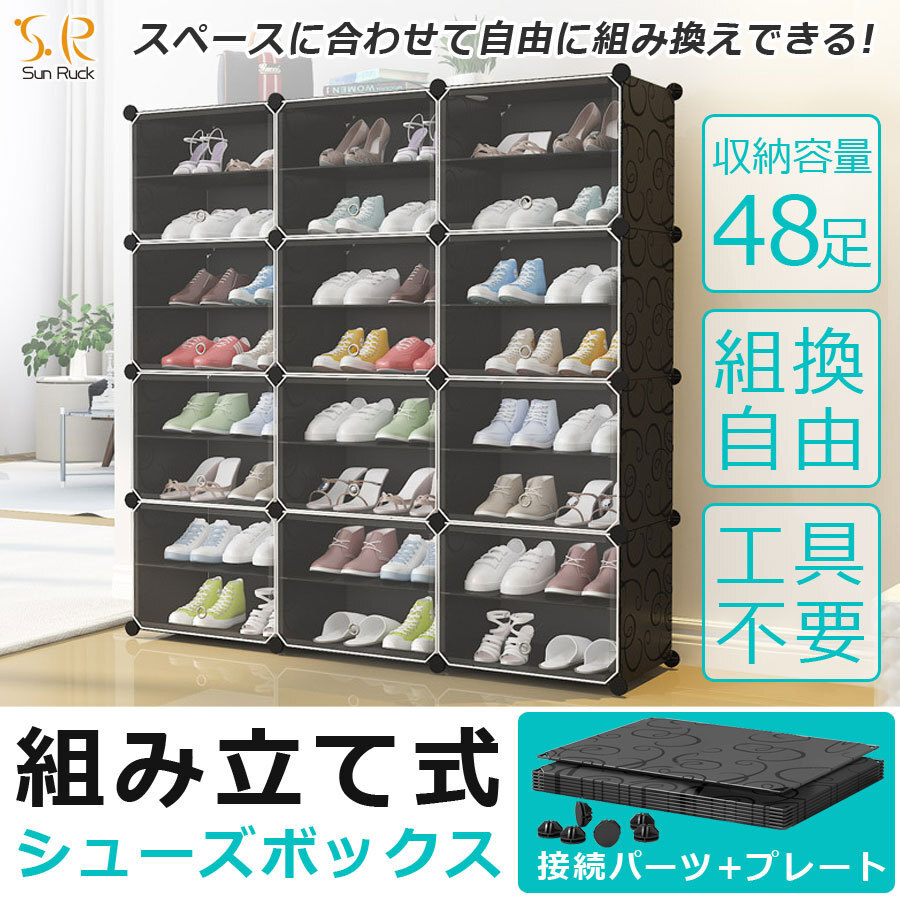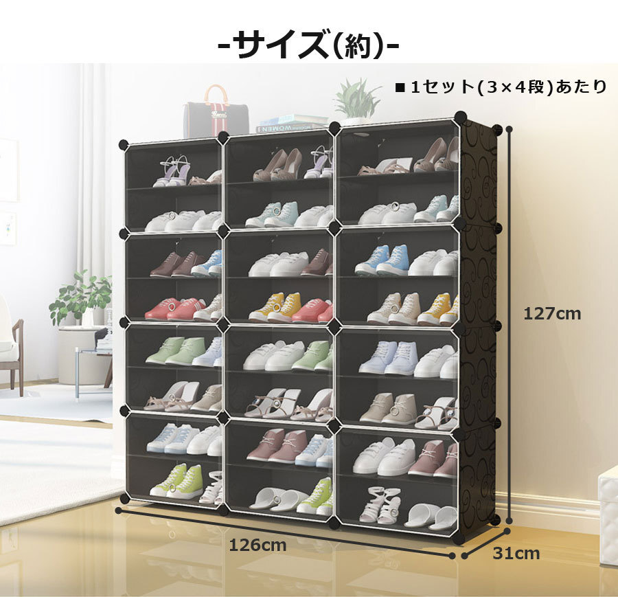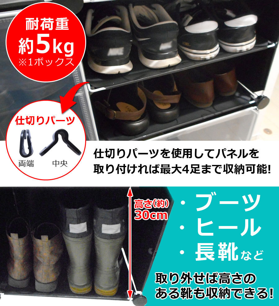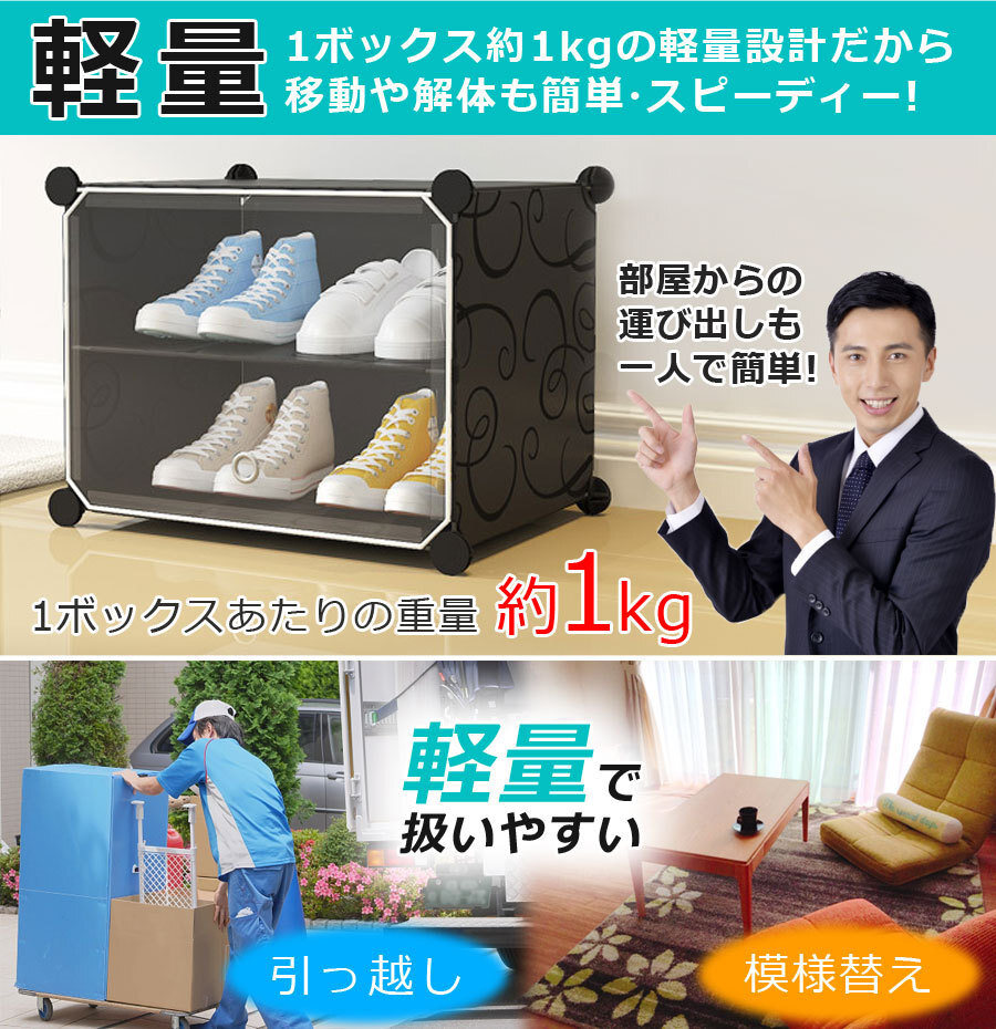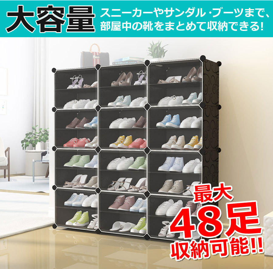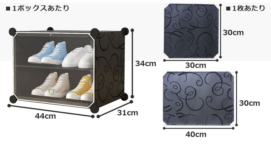 ![]() ![]() ![]() ![]() ![]() ■設置場所の環境やスペースに合わせて、ボックスのレイアウトを自由自在に変更可能。すき間収納やスポット収納に便利!ブロックのようなシンプルなデザインで、1セットあればお部屋の様々な場所に置いて使える。 ![]() ![]() ■1セットすべてつなげた状態なら、スニーカーやサンダルなど、家族全員分の靴もラクラク収納できる大容量。 ボックス内に仕切りを取り付ければ1ボックス4足、1セット分12ボックスなら最大48足まで収納可能。取り外せば、高さ30センチまでのブーツやヒールなど、高さのある靴も立てたまま入れることができます。 | ||||||||||||