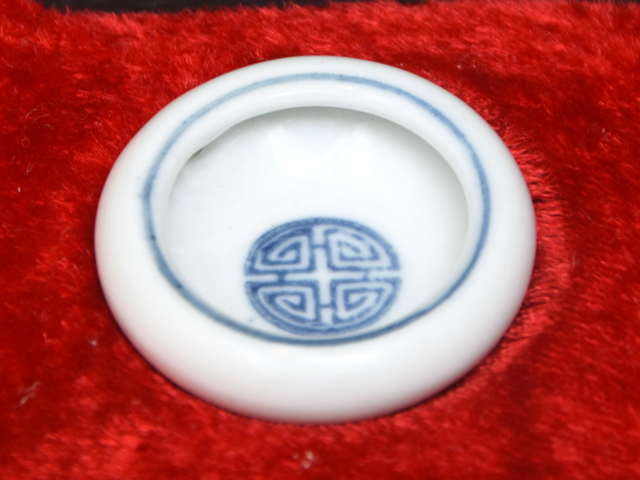 【硯】 横幅:7㎝ 奥行:10㎝ 高さ:1.4㎝ 重量:223g 【筆】 全長:18.1㎝ 【墨】 高さ:6㎝ 横幅:1.3㎝ 【水皿】 胴径:4㎝ |