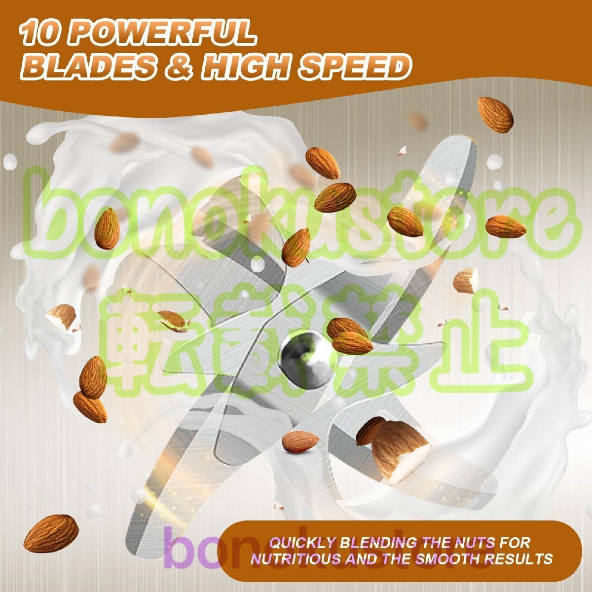 スムーズなブレンディング:アーモンドミルクメーカーは、当社の研究室で何百時間もテストされた独自のカスタマイズされたブレードを備えています。 10枚刃の強力クロスステンレス刃で設計されており、2枚刃はサメの刃として設計されているため、栄養素を簡単に抽出できます。鋭い刃で様々な食材を簡単に扱うことができます。内蔵された四角形の撹拌柱により、成分を漏れなく繰り返し衝突させることができ、滑らかな味わいを実現します。