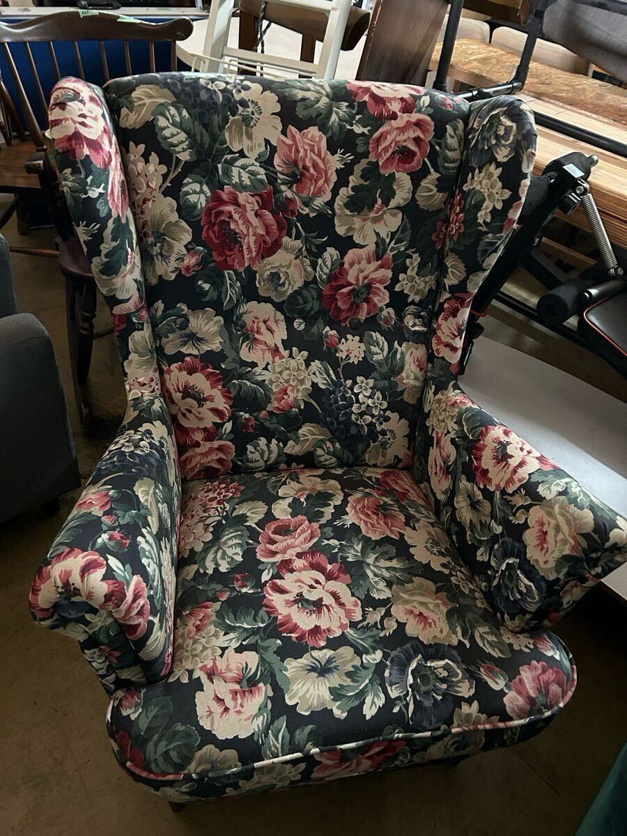 華やかな花柄ファブリックが目を引く、クラシカルなウィングバックソファです。オットマン付きで、ゆったりと足を伸ばしてくつろげます。お部屋のアクセントや撮影用にもおすすめです。