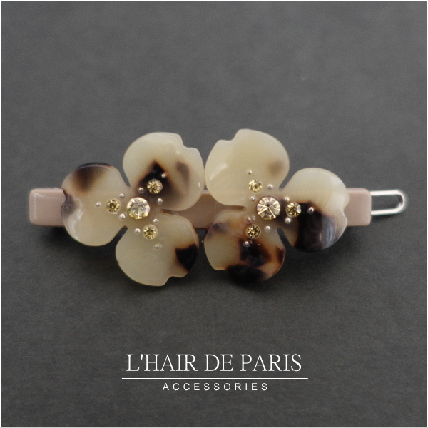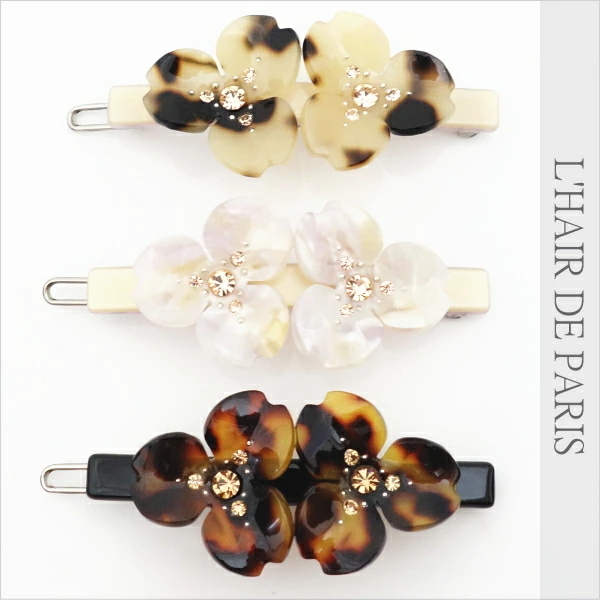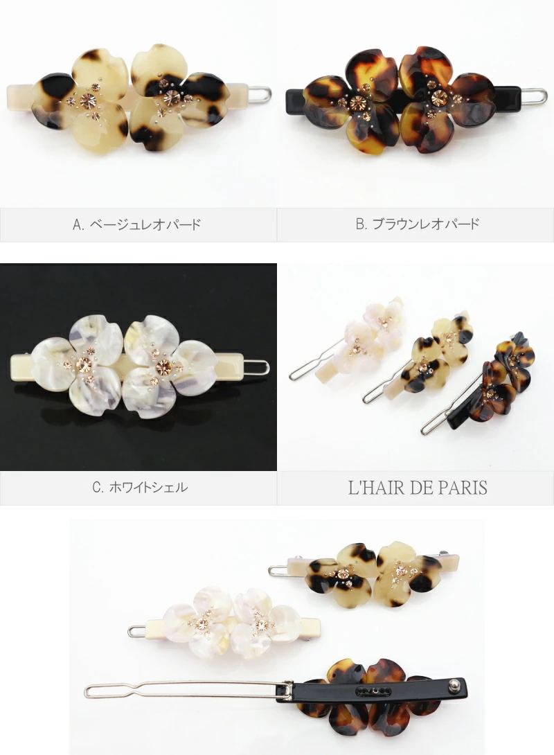 フランス製セルロースを使用したラグジュアリーなヘアピンです。 高級メゾンのアイウェアやアクセサリー等でも使われている上質な素材で、 美しいマーブル模様に艶やかな光沢があり、上品で柔らかい質感が特徴です。 前髪やサイドをちょこんと留めるのにぴったりのサイズ感。 お食事の時や夕方髪型が崩れて来た時などに、 ポーチにひとつ忍ばせておくと、便利で使えるアイテムです♪ お花の中央にはスワロフスキークリスタルが施されております。 シックな中にも可愛さのあるデザイン&お色をセレクトしました♪ アレクサンドル・ドゥ・パリやアッカacca・コンプレックスビズ・フランスラックス等の ヘアアクセサリーブランドがお好きな方にも気に入っていただけるお品だと思います。 こちらのお色はグレージュです。 お色違いや同じシリーズのバンスクリップ・バレッタ等50種類以上ございます。 可愛いヘアアクセサリー多数出品中です♪こちらからご覧いただけます^^ サイズ 約横幅6cm×縦2.5cm | ||