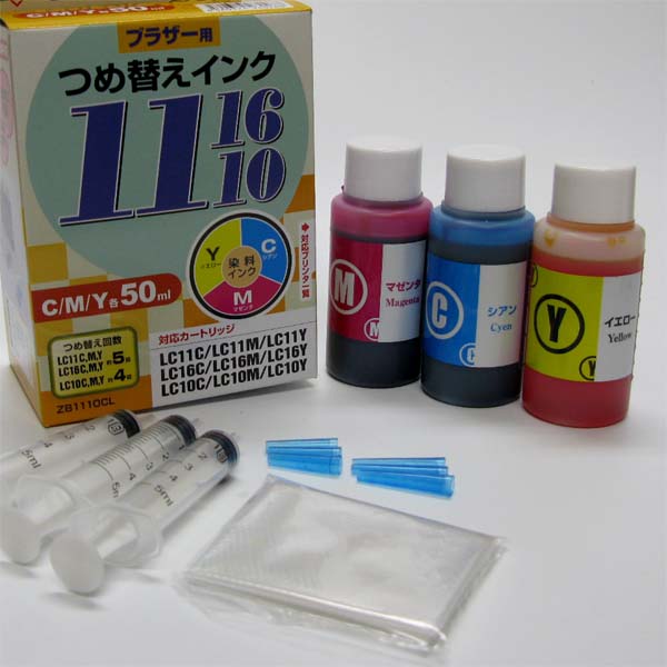 | 商品説明 | ■ZB1110BK+ZB1110CL: 新品未開封の商品です。 ■詰め替え方法はカンタンで分かりやすい取扱説明書がついています。 ■※ブラックは顔料インクを採用!こだわりの高品質の詰め替えインクです。 ■セット内容 ブラック(顔料)50ml シアン50ml マゼンタ50ml イエロー50ml 詰め替えキット一式 ■対応カートリッジ型番 LC10BK/LC11BK/LC12BK/LC16BK/LC17BK/LC10C/LC11C/LC12C/LC16C/LC17C LC10M/LC11M/LC12M/LC16M//LC17M/LC10Y/LC11Y/LC12Y/LC16Y/LC17Y ■対応機種は下記の通りです。 MFC-6890CN/MFC-6490CN/MFC-6890CN/MFC-5890CN/MFC-5860CN/MFC-J960DN/MFC-J960DWN MFC-J950DN/MFC-J950DWN/MFC-935CDN/MFC-935CDWN/MFC-930CDN/MFC-930CDWN MFC-J860DN/MFC-J860DWN/MFC-J855DN/MFC-J855DWN/MFC-J850DN/MFC-J850DWN/MFC-J805D/MFC-J805DN MFC-J800D/MFC-J800DW/MFC-735CD/MFC-735CDW/MFC-J710DW/MFC-710D/MFC-J700D/MFC-J700DW MFC-695CDN/MFC-695CDWN/MFC-675CD/MFC-675CDW/MFC-670CD/MFC-670CDW/MFC-J615N/MFC-495CN/MFC-490CN DCP-J940N/ DCP-595CN/DCP-J740N/DCP-J715N/DCP-J540N/DCP-535CN/DCP-J515N/DCP-390CN/DCP-385C DCP-165C/DCP-155C/DCP-330C/DCP-350C/DCP-750CN/DCP-770CN/DCP-740N/DCP-940N/MFC-460CN/MFC-480CN MFC-630CDW/MFC-630CD/MFC-650CD/MFC-650CDW/MFC-850CDN/MFC-850CDWN/MFC-860CDN/MFC-870CDWN/MFC-880CDN/MFC-880CDWN |
