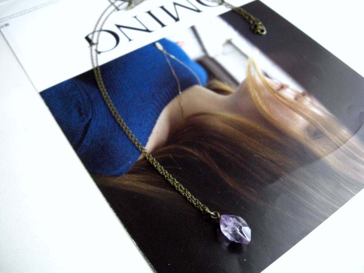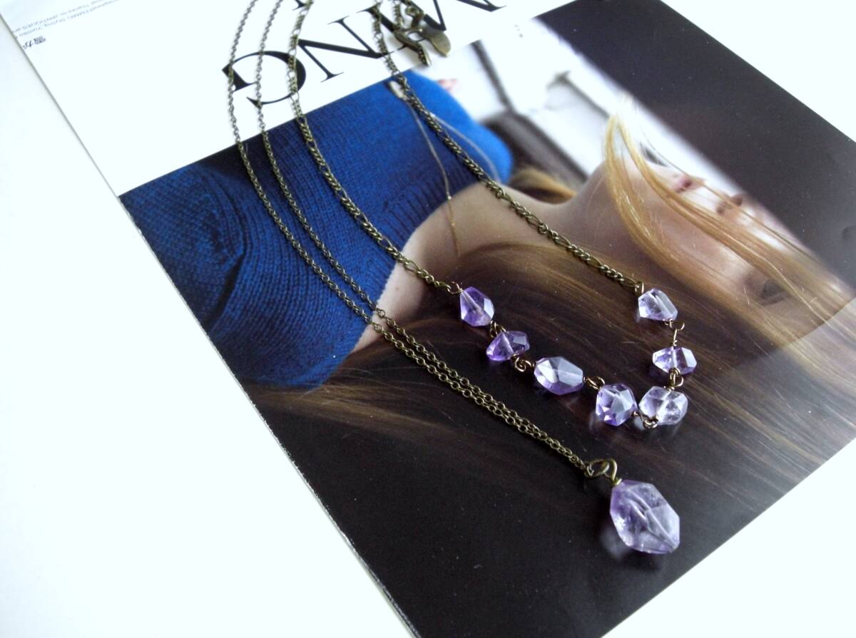 透明度の高いラフ・カットのアメジストは可憐な表情と存在感があります♪画像のように2点セットや単品でも楽しんでいただけます♪デザインチェーンに8ミリから10ミリ位までのアメジストを繋いだネックレスは全長65センチ位で調節自由です♪トップが15ミリ×20ミリ位のアメジストのネックレスは70センチ+アジャスター12センチで最長82センチ位です♪それぞれ単品やお揃いのシリーズも出品しています♪ハンドメイドをご理解いただいてノークレーム、ノーリターンでお願いします。