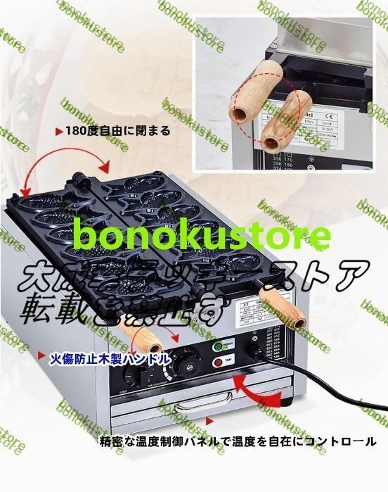 50~300°C (122~572°F)の温度範囲で、わずか3~5分で複数のフィッシュワッフルを一度に焼くことができます。 時間が経過すると、機械が通知し、表面が焦げ付きにくくなります。