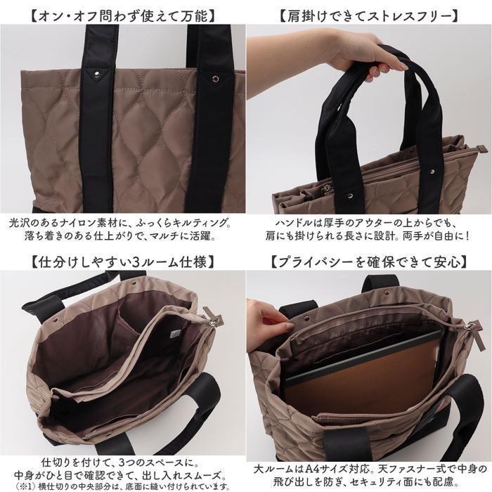 商品説明 | ・・【簡単に仕分けできて収納上手に♪】 ・仕切り&ポケットで使いやすさ抜群!「LIZDAYS キルティングナイロントートバッグ」。 ・【オン・オフ問わず使えて万能】 ・光沢のあるナイロン素材に、ふっくらキルティング。落ち着きのある仕上がりで、マルチに活躍。 ・【肩掛けできてストレスフリー】 ・ハンドルは厚手のアウターの上からでも、肩にも掛けられる長さに設計。両手が自由に! ・【仕分けしやすい3ルーム仕様】 ・仕切りを付けて、3つのスペースに。中身がひと目で確認できて、出し入れスムーズ。 ・(※1)横仕切りの中央部分は、底面に縫い付けられています。 ・【プライバシーを確保できて安心】 ・大ルームはA4サイズ対応。天ファスナー式で中身の飛び出しを防ぎ、セキュリティ面にも配慮。 ・【使い勝手の良い中ルーム】 ・ポーチやお弁当箱がすっぽり。エチケットグッズなどの収納にも便利。 ・【ペットボトルが収納できる小ルーム】 ・・500mlペットボトルや折りたたみ傘を縦向きに収納。倒れる心配も不要。 ・【ソフトな底板入りで安定性をプラス】 ・底板を内蔵することで、程よく安定した状態をキープ。 ・【サッと取り出せて迷子知らず】 ・内側・外側合わせて4つのポケットを配置。バッグの中で小物を探す手間が不要。 ・【軽量ながらガシガシ使えて丈夫】 ・軽やかな使い心地で疲れにくく、アクティブシーンでも重宝。耐久性もあり、頼りになる相棒に。 ・【ちょっとの雨なら大丈夫】 ・表面に汚れや水滴を弾きやすい、撥水加工済み。お手入れも拭き取るだけ。 ・(※2)完全防水ではありません。 ・【お気に入りを選べるカラー】 ・コーデを選ばないベーシックカラーをラインナップ。ブラックの部分使いも素敵にマッチ。 ・【ポケット仕様】 ・内側:オープンポケット×3 ・前面:オープンポケット×1 |