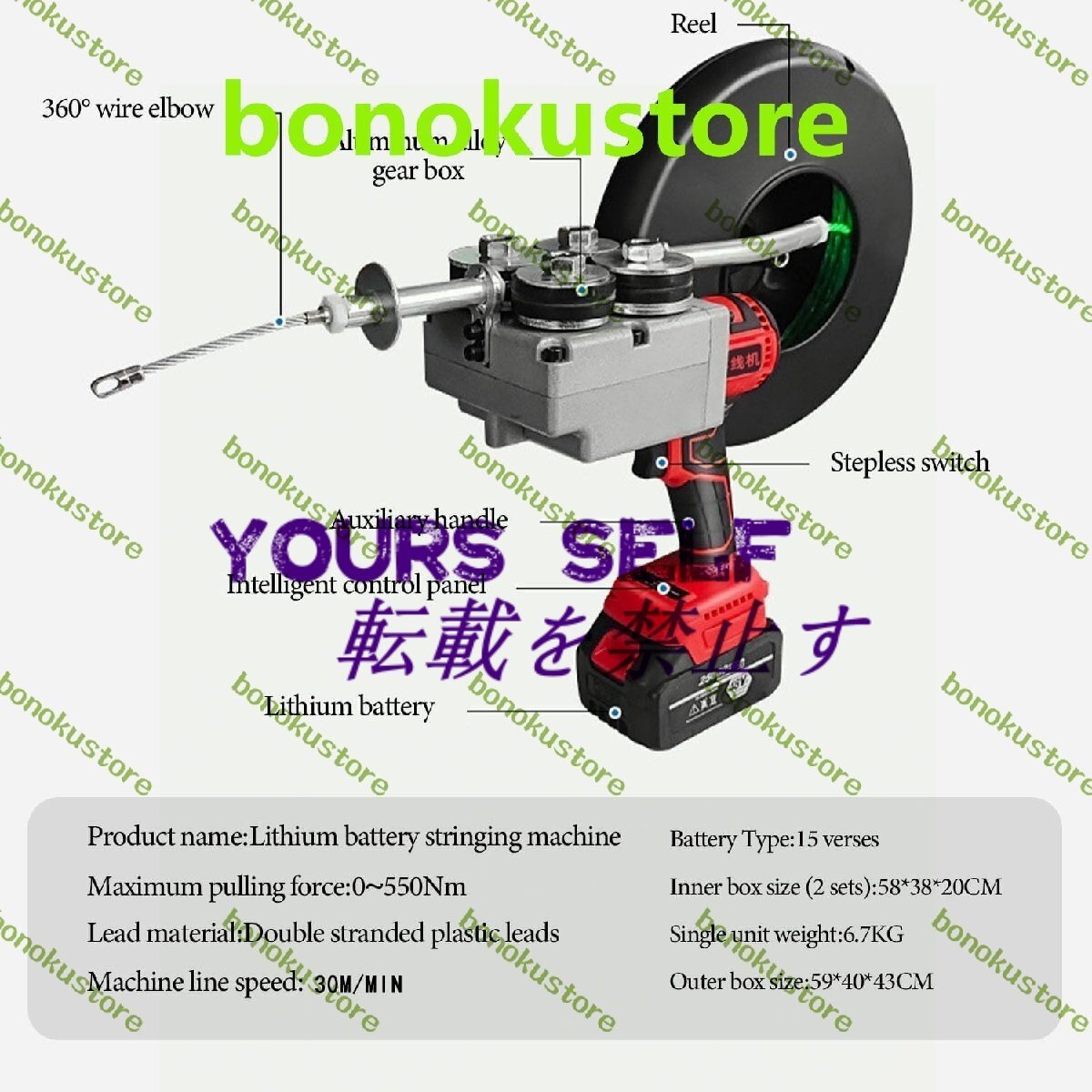 コードレス電気技師用ワイヤースレッダー、0-550Nm 電線引っ張りツール、リチウム電池 2 個付き、30 メートル/分ブラシレスリチウムパイプルーティングマシン、20 メートルワイヤー付き