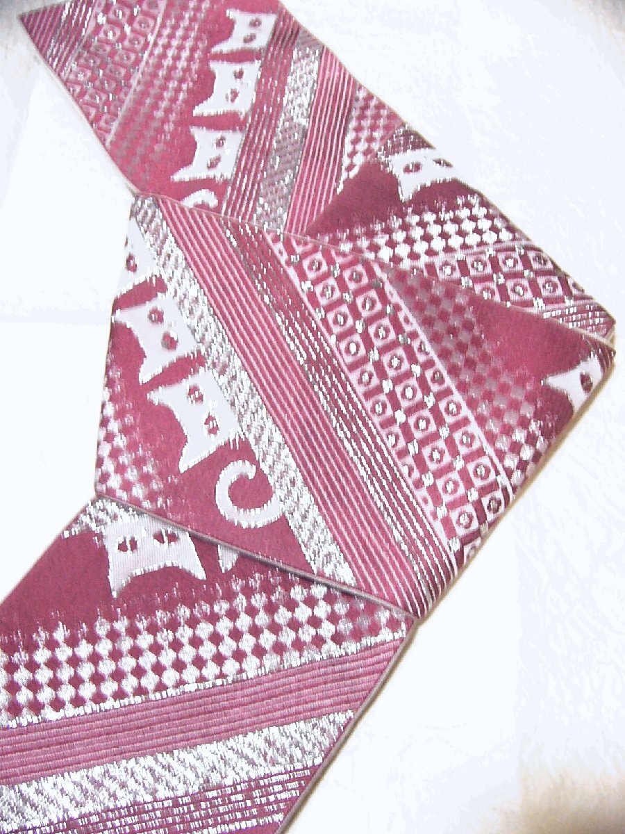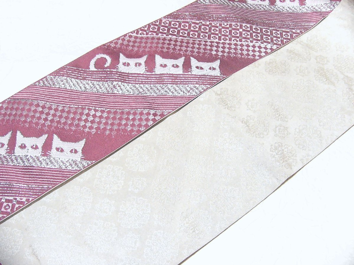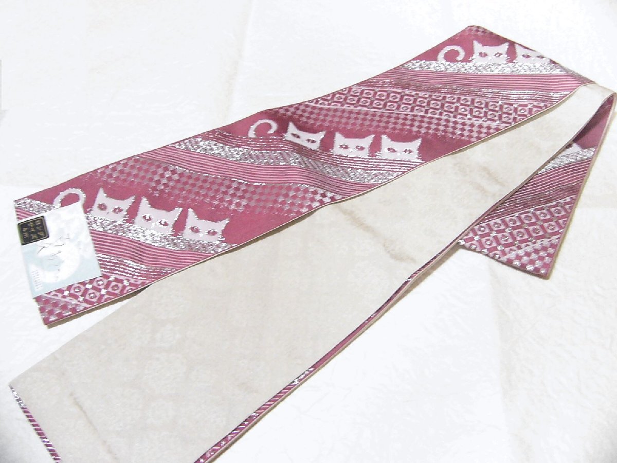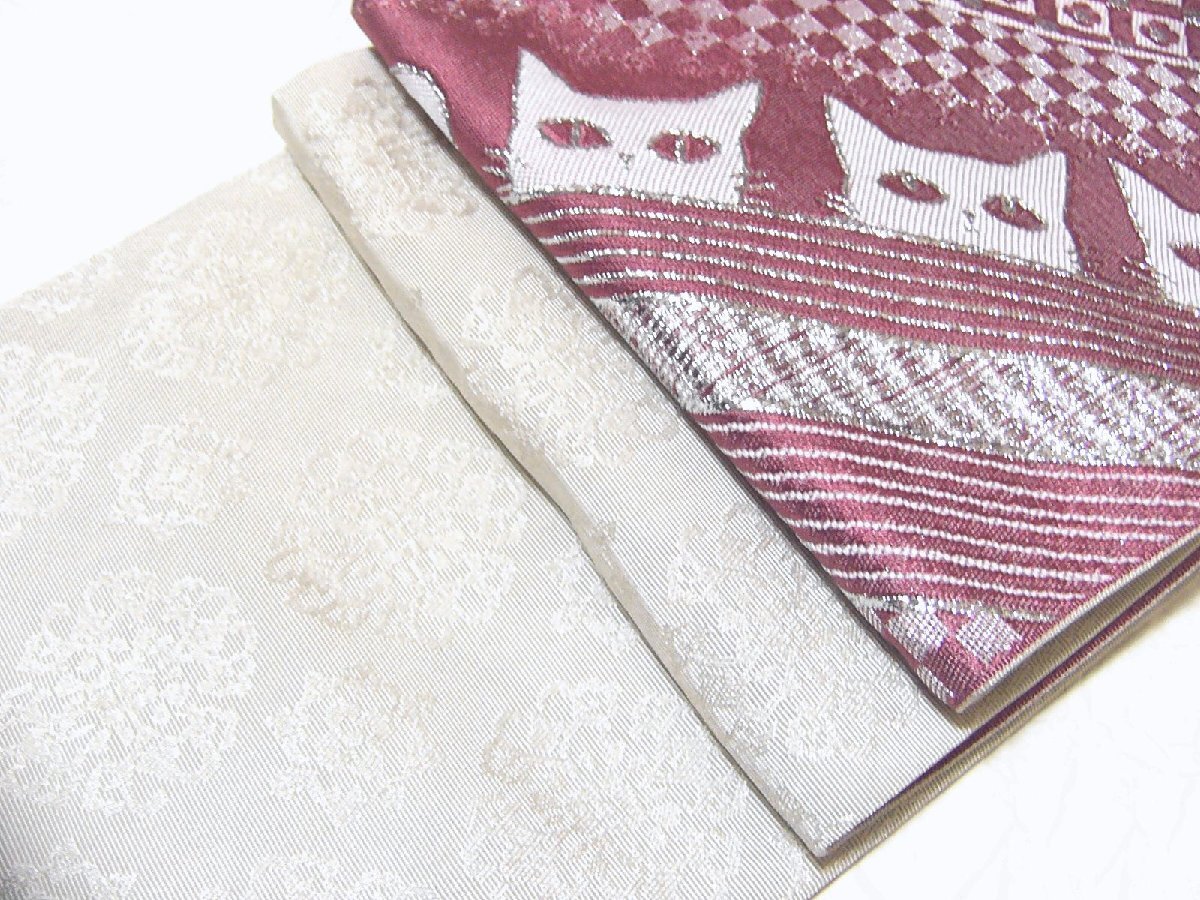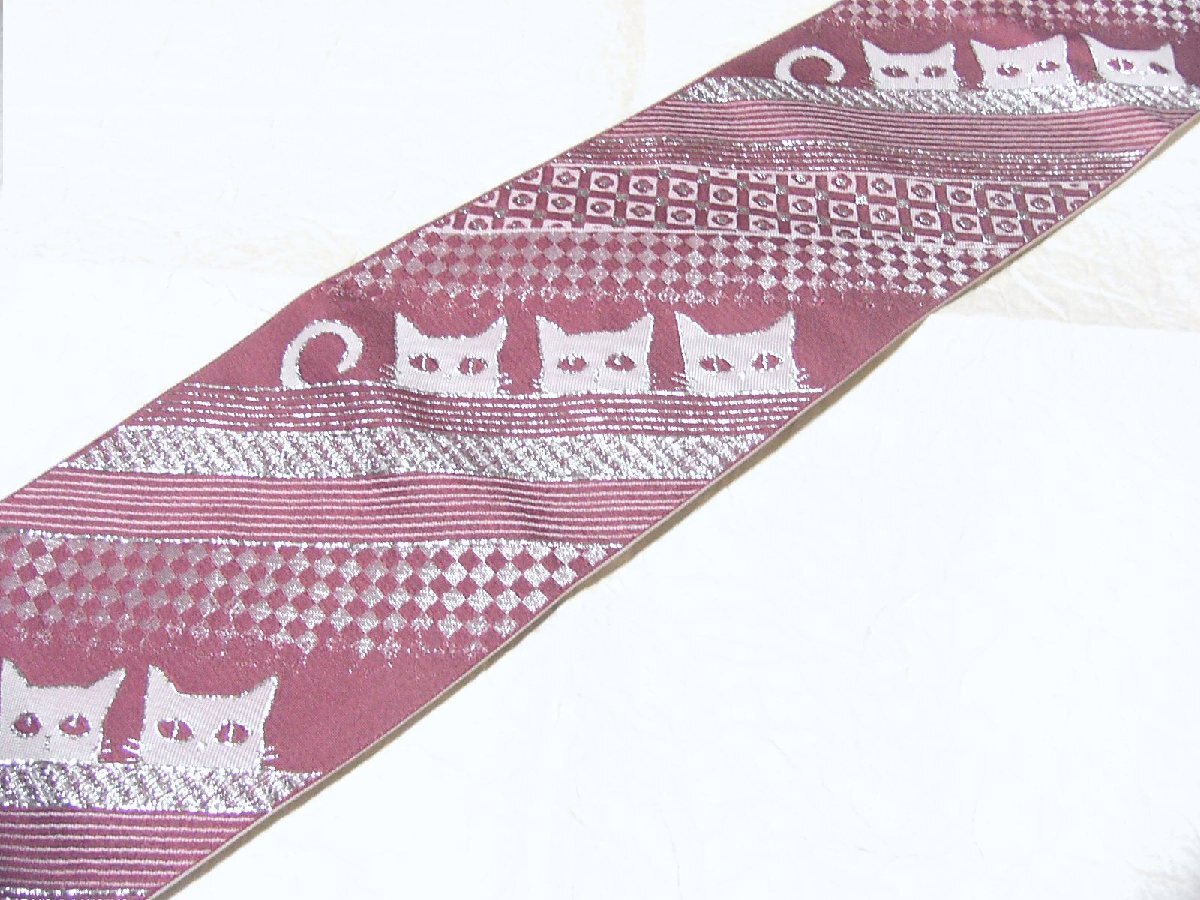 片面は淡くくすんだ赤紫色系の少し淡いオールドライラック色のような色合いで斜線柄の中にかわいい子猫柄の織物です。