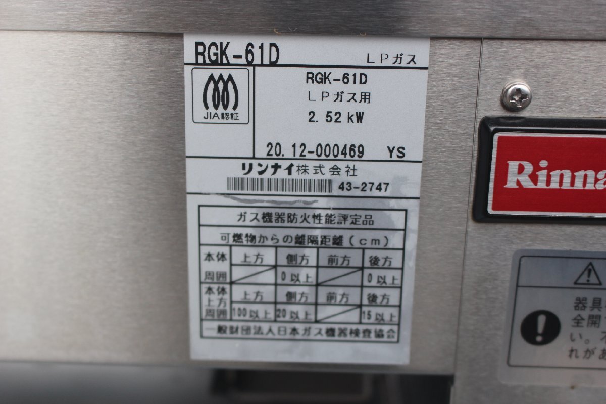 | ★送料込み wz0525 リンナイ Rinnai RGK-61D 串焼 中古 業務用 グリラー LPガス 2020年 厨房機器 飲食店 |