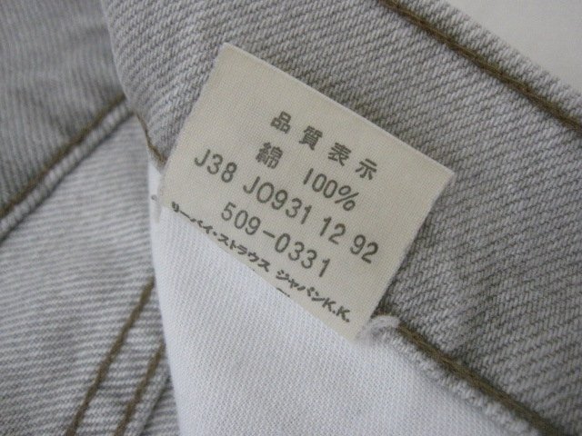 92年製Levisリーバイス ブラックジーンズ(薄グレー) 509-0331 日本製 32インチです。ユーズドです、前面、各所ダメージございます、画像ご確認の上よろしくおねがいします。ノークレームノーリターンノーキャンセルでお願いします。