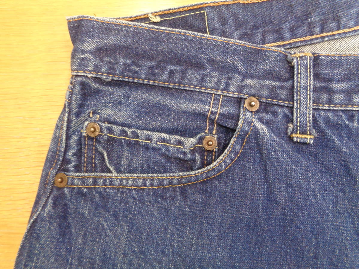 平行ステッチ、ウエストチェーン、トップ裏4、フライボタンは脚長R、ウォッチポケット裏セルヴィッジ無し、アウトシームセルヴィッジ、紙パッチ S表記、イエローステッチ部分ありというディティールから60年代後半に製造された後期型の物であると思います。