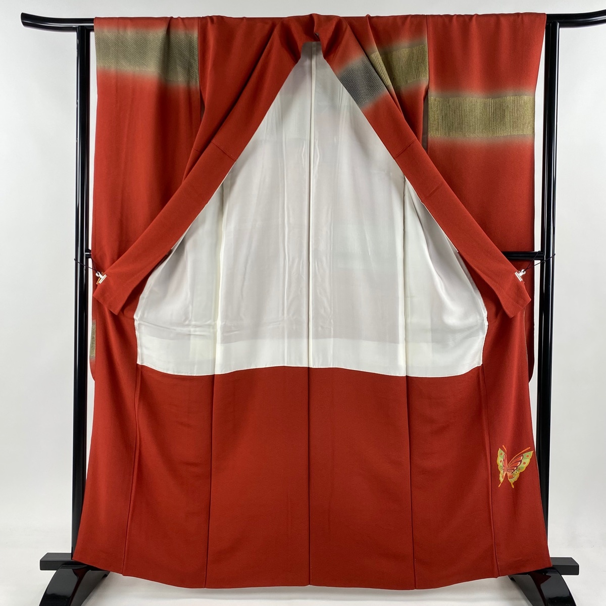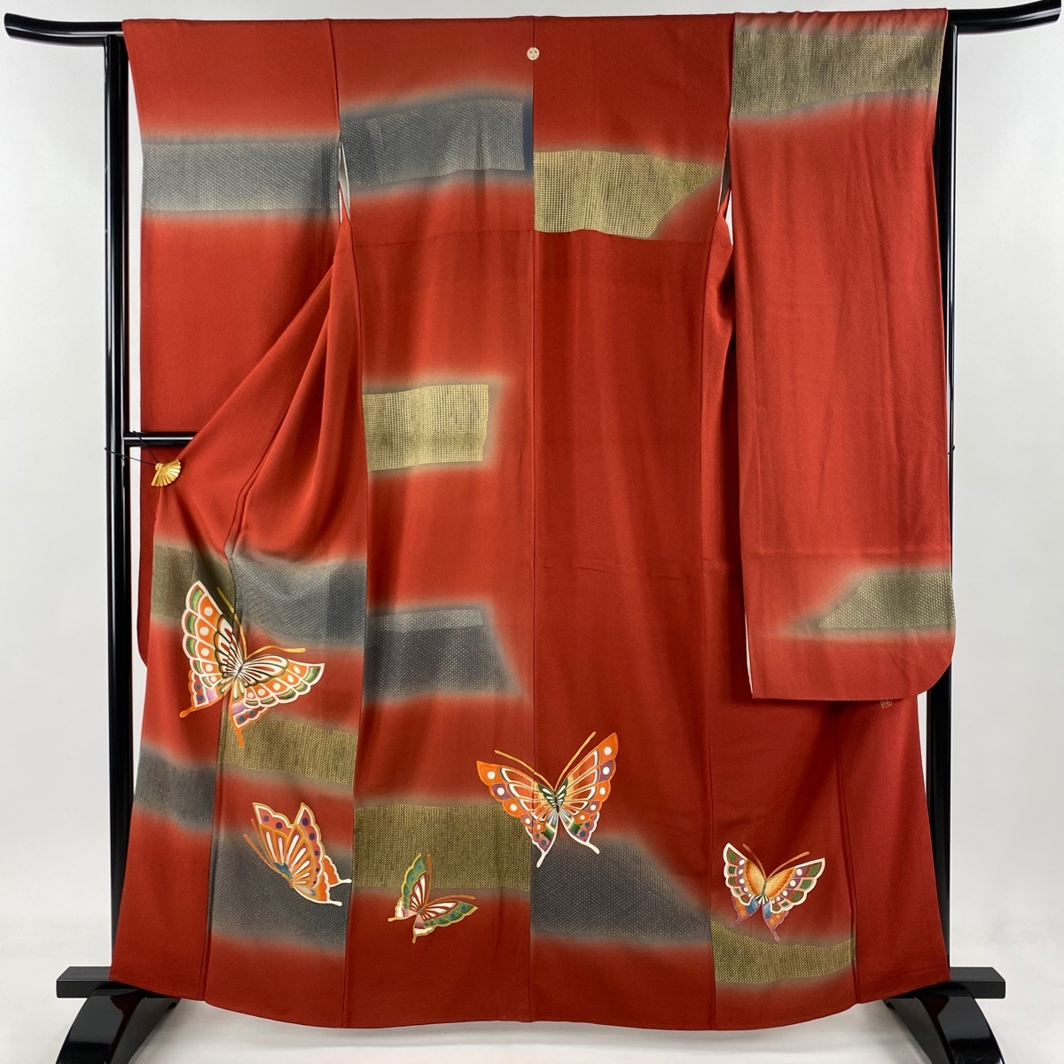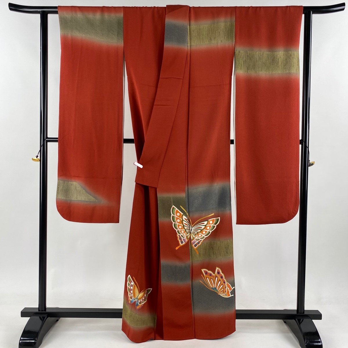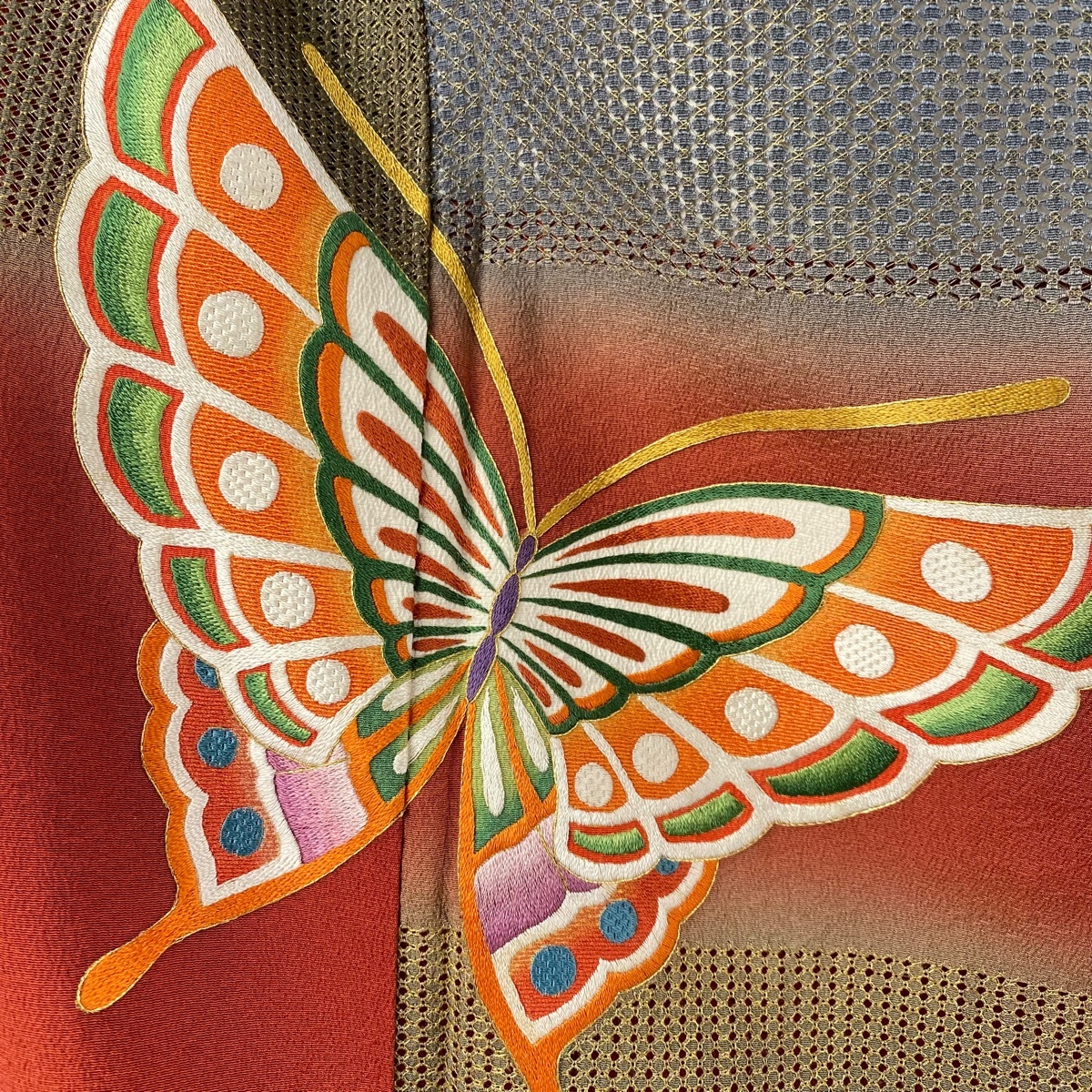 振袖 美品 逸品 蝶 段縞 刺繍 金糸 赤 袷 身丈163 裄丈64.5 M 正絹 【中古】 |