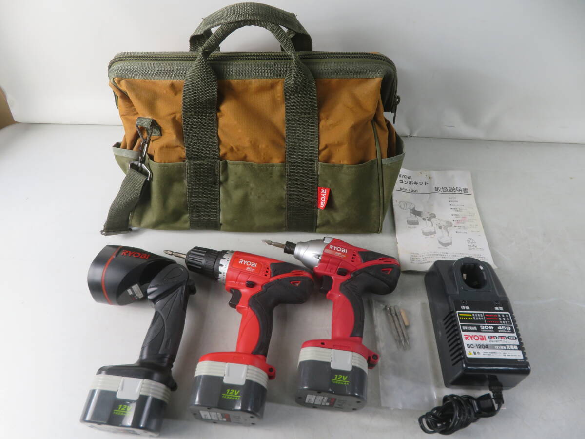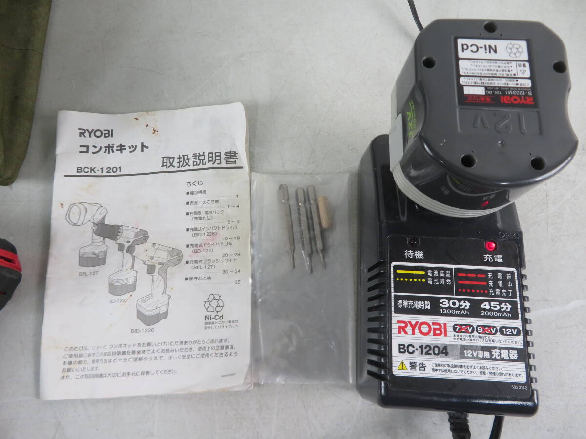 【状態】 充電器とすべてのバッテリの通電・動作確認済み。ただし、短時間での動作確認のみとなります。全て直前まで問題なく使用していたものです。多少の使用感、スレ、汚れなどありますが、中古のわりに比較的状態はきれいな方だと思います。 収納バッグと付属の工具類は、おまけです。バッグはシミ、汚れ、色褪せなど使用感がありますが、まだまだ充分ご活用いただけると思います。 【内容】 ・充電式インパクトドライバ (BID-1226) ・充電式ドライバドリル (BD-122) ・充電式フラッシュライト (BFL-127) ・充電器12v専用 (BC-1204) 【附属品】 画像のものが全てです | |||