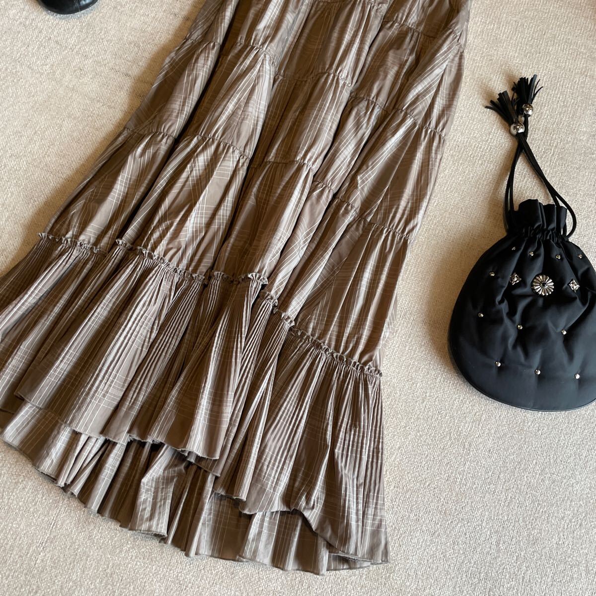 上品でクラス感のあるタフタ素材を使用し、細部まで計算されたデザインのティアードスカート。切り替えごとに異なるプリーツ幅が女性らしく美しいシルエットを演出。前後差をつけて、足さばきも良く、軽やか。裾にはピンタックの様に見える繊細なクリスタルプリーツを施し、アクセントに。