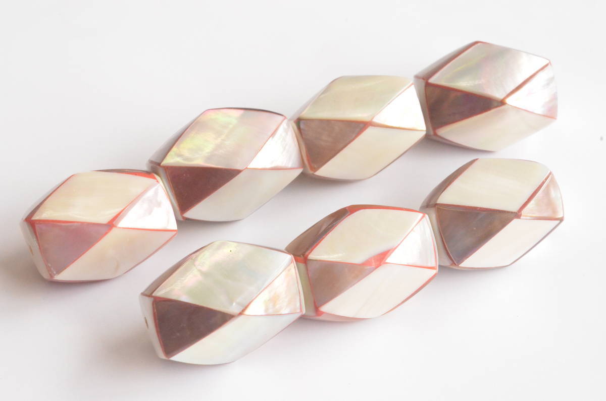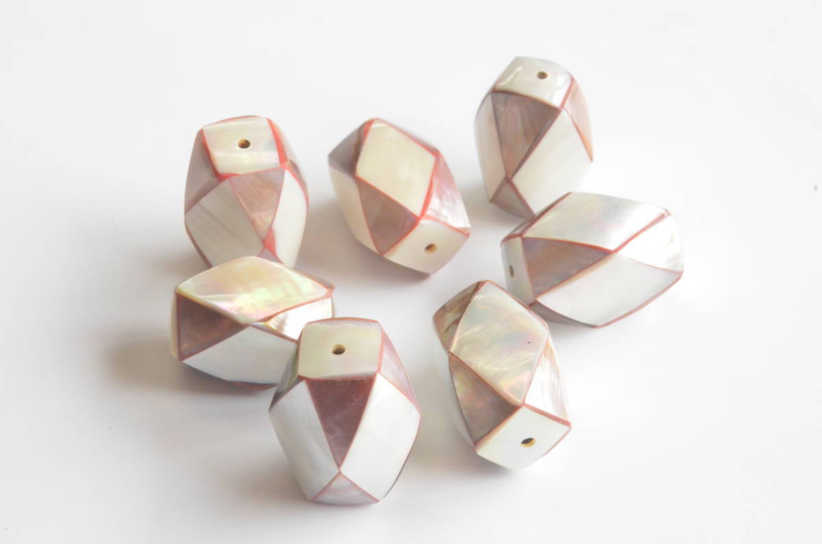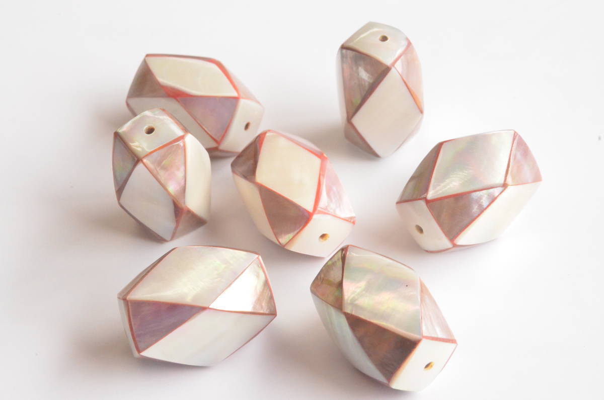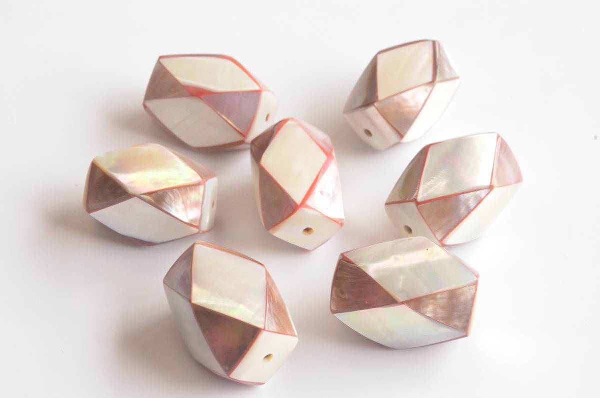 ハンドメイドアクセサリーなどに最適なウッドビーズパーツです。表面には白蝶貝と桃蝶貝が貼られており、美しい光沢と上品な色合いが魅力です。穴あきで、ネックレスやブレスレット作りにそのままご使用いただけます。