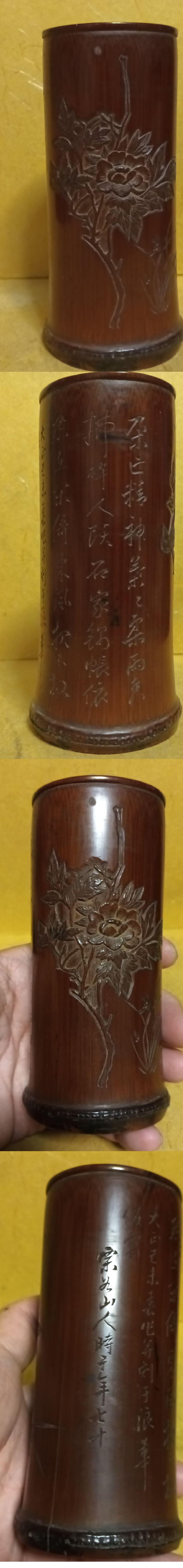 清時代 牧丹 花草 唐詩 彫刻 筆筒 筆立 4.8x13cm 栗為山人 70才 書道具 竹彫刻 竹製 文房具 書道具 時代物 中国古美術