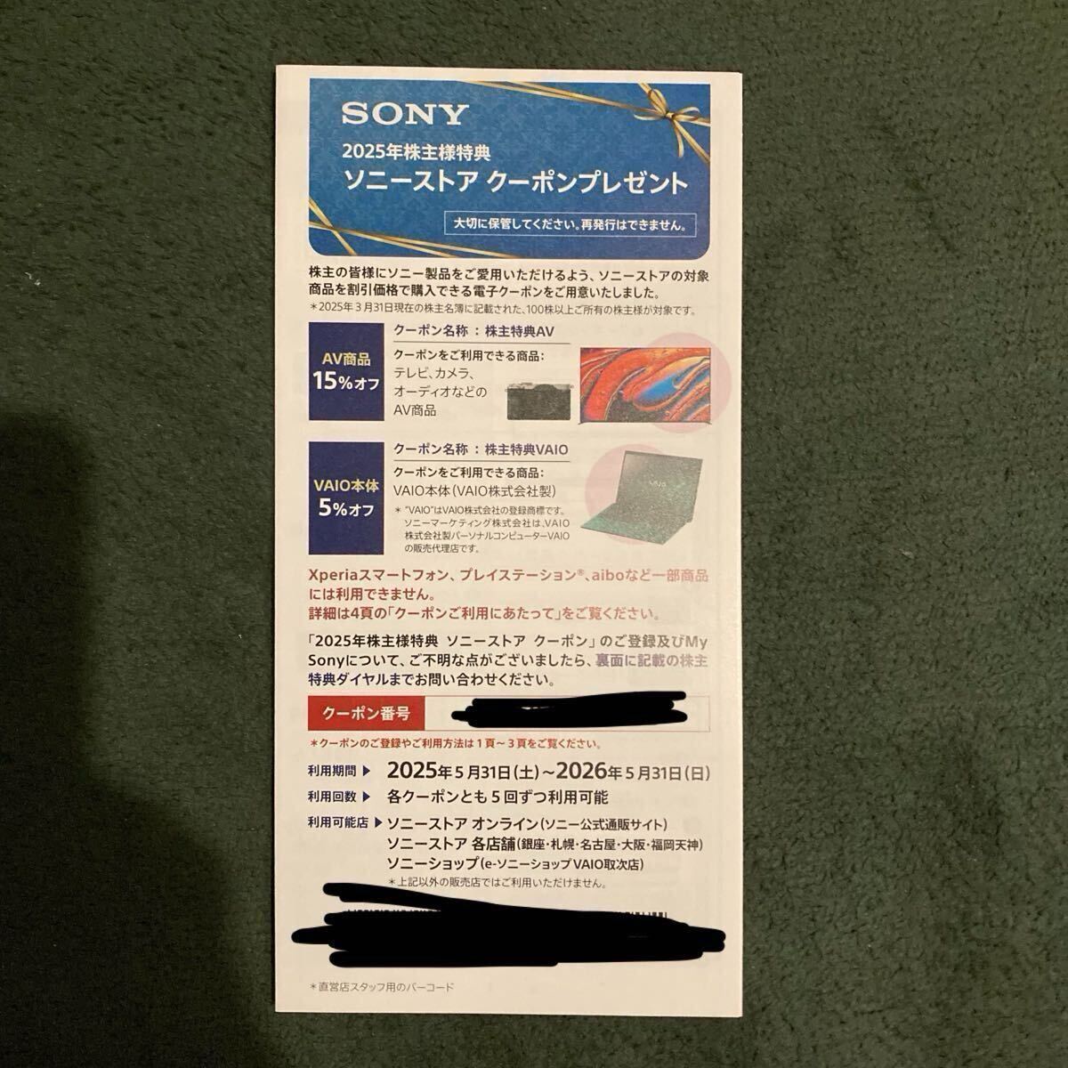 SONY 2025年株主優待特典のソニーストアクーポンです