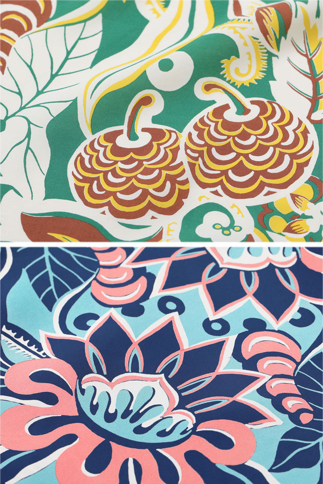 アロハシャツの黄金時代とされる1930~50年代にかけて作られた「ヴィンテージ」と呼ばれる貴重なアロハシャツを再現し、現代に蘇らせているブランド「SUN SURF」から、レーヨンアロハシャツ「FLOWER FIELD BORDER」(SS39430)のご紹介です。 抽象的に描かれた南国の草花が強烈なインパクトを放つ一枚。 植物のモチーフで構成されたデザインで、前身頃にボーダー・パターンができるようにモチーフがレイアウトされています。 また、生地全体の中央部分はオールオーバー・パターンでデザインされ、後身頃の部分に使われています。 生地の両端の部分には無地場を作り、前立て部分や襟、袖口などに使用。 箇所によって柄と無地場がアクセントになるように計算し、プリントされた非常に興味深い一枚です。 ボディーには、てろんとしたフィラメントレーヨン生地を採用しました。 | ||||||||||||||||||||||||||||||
