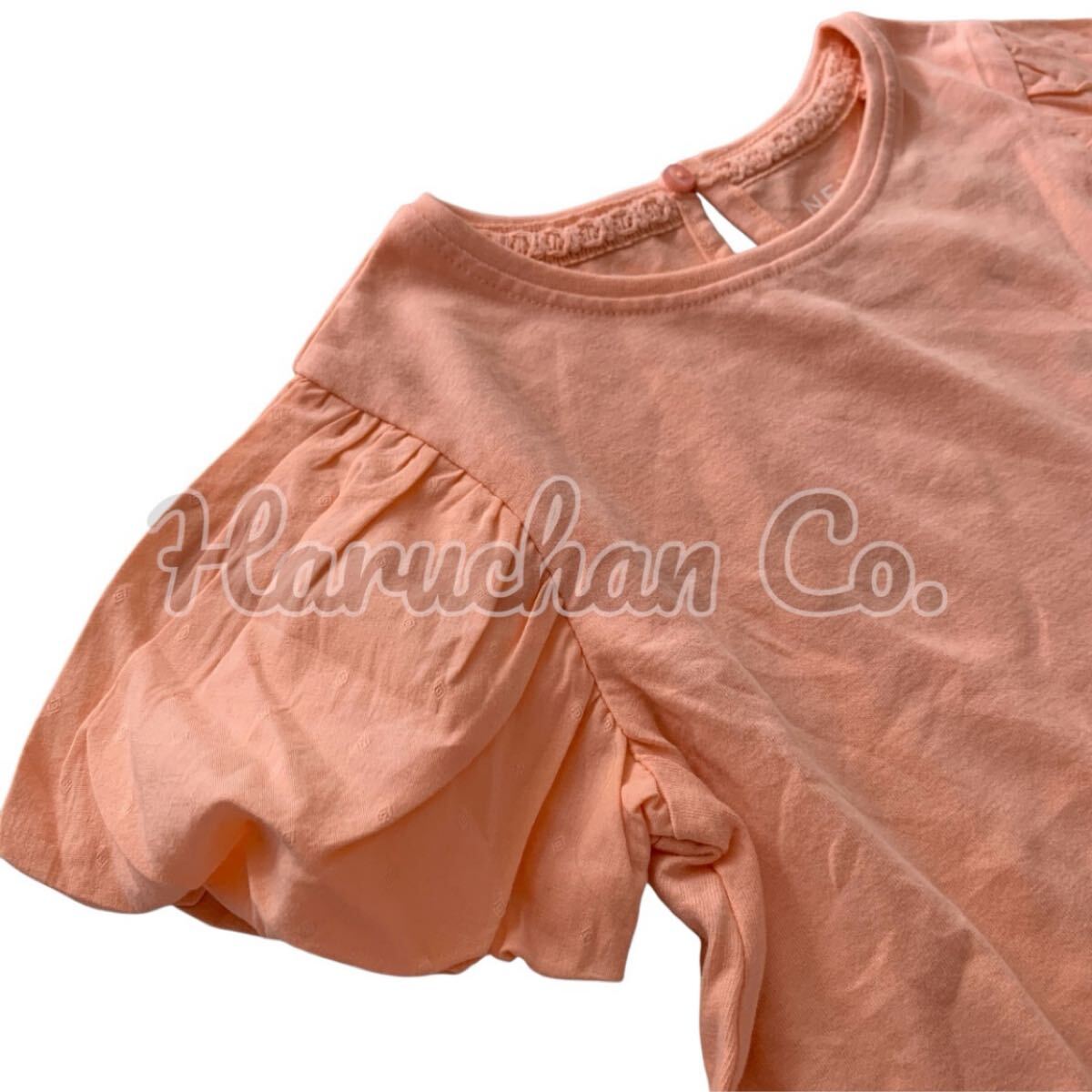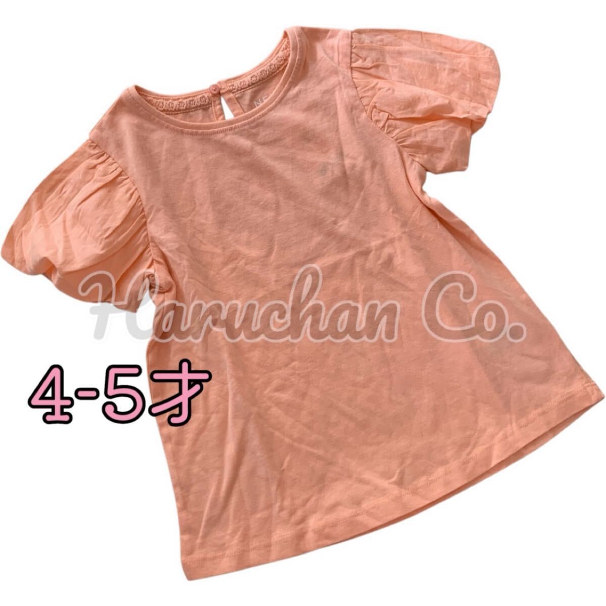 サーモンオレンジの、シャツ素材のパフスリーブがキュートなカットソー