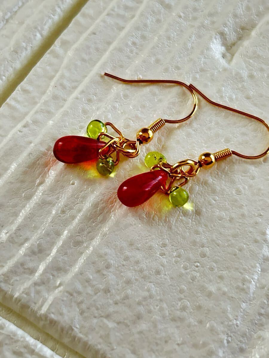 まるで森の中で見つけた小さな熟した果実のようなレッドと、瑞々しい葉のようなビーズを組み合わせて可愛らしく仕上げた作品です。