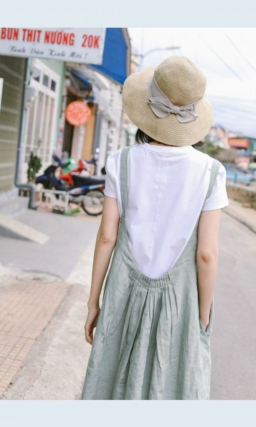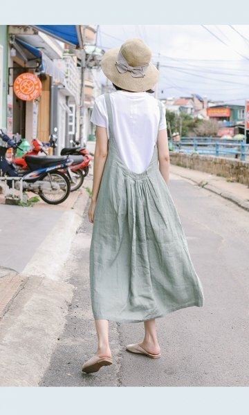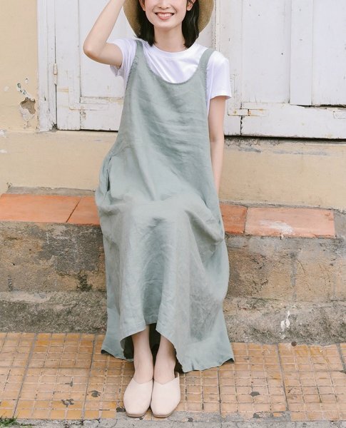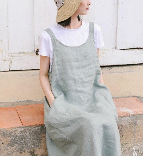 kr 2408 サスペンダースカート サロペット ゆったり フリーサイズ グリーン 大人可愛 ナチュラル 麻100% RINEN リネン サラサラ