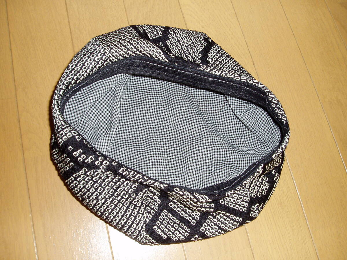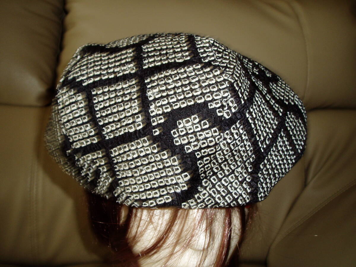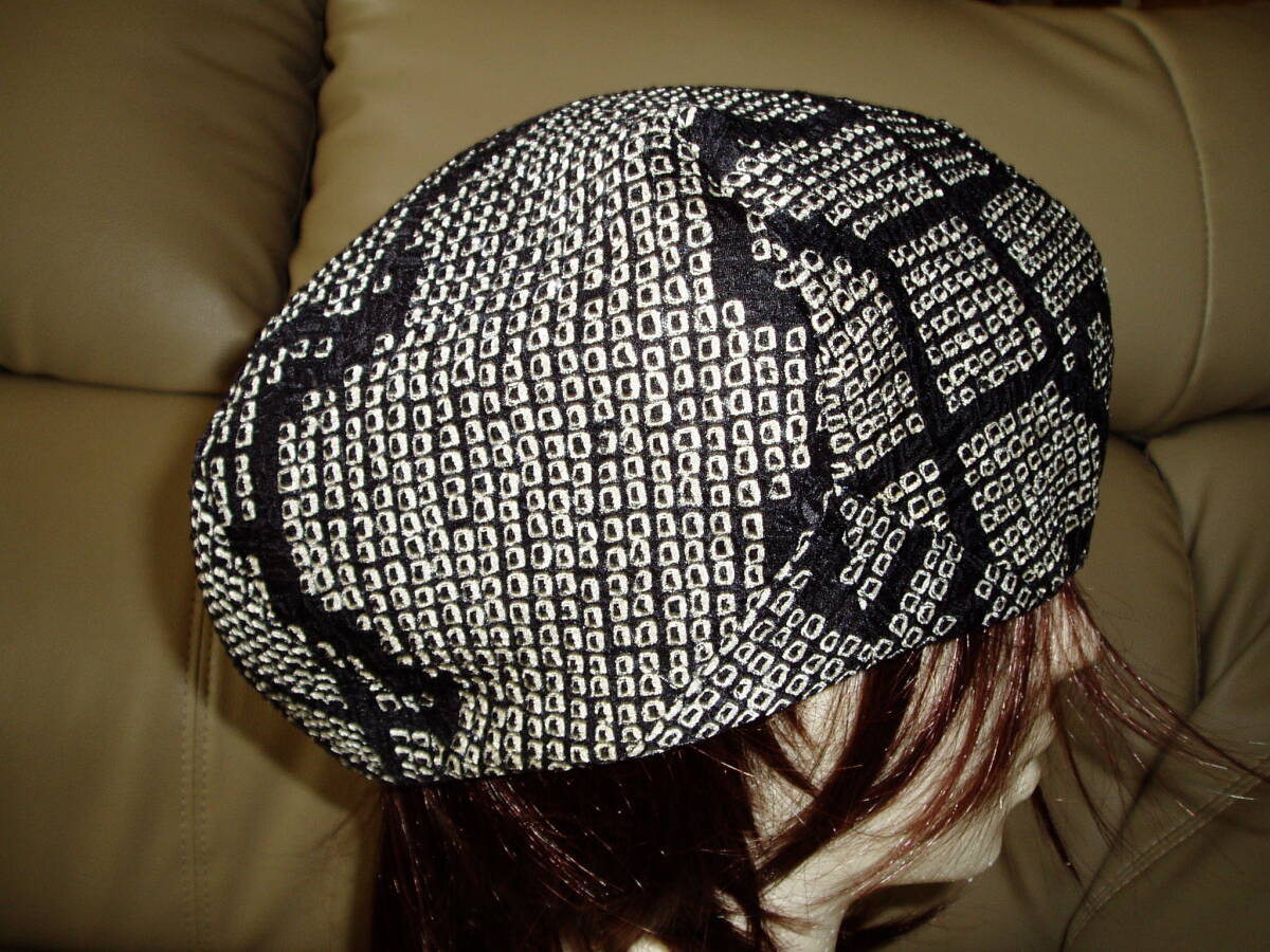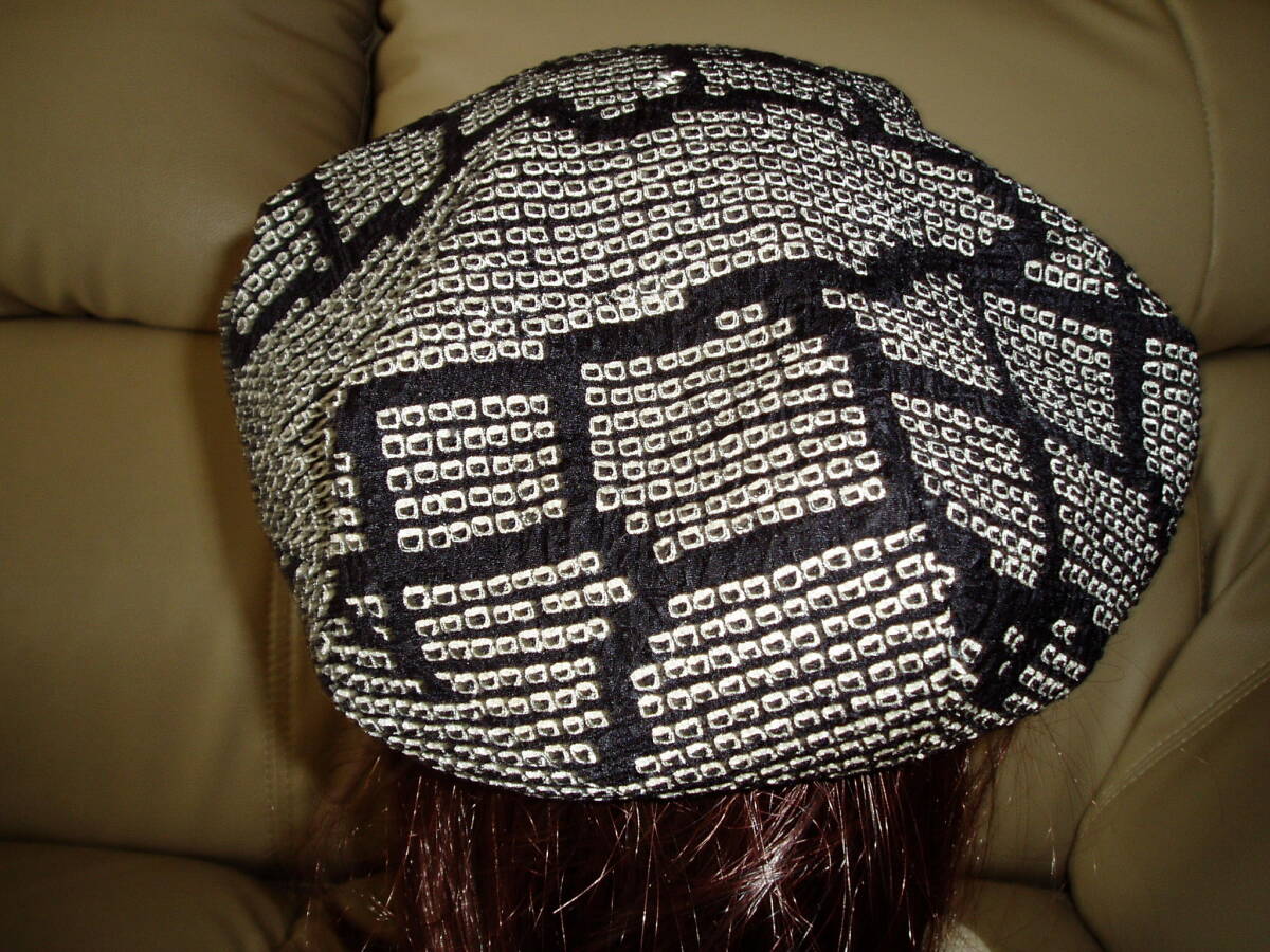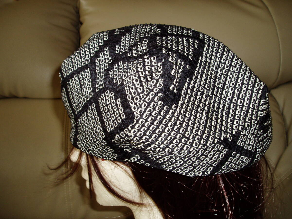 黒模様のある絞り布からの、クラウン風な六角形ベレー帽です。