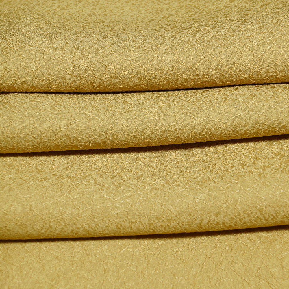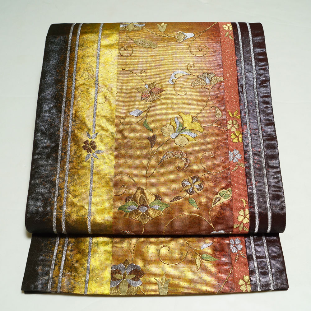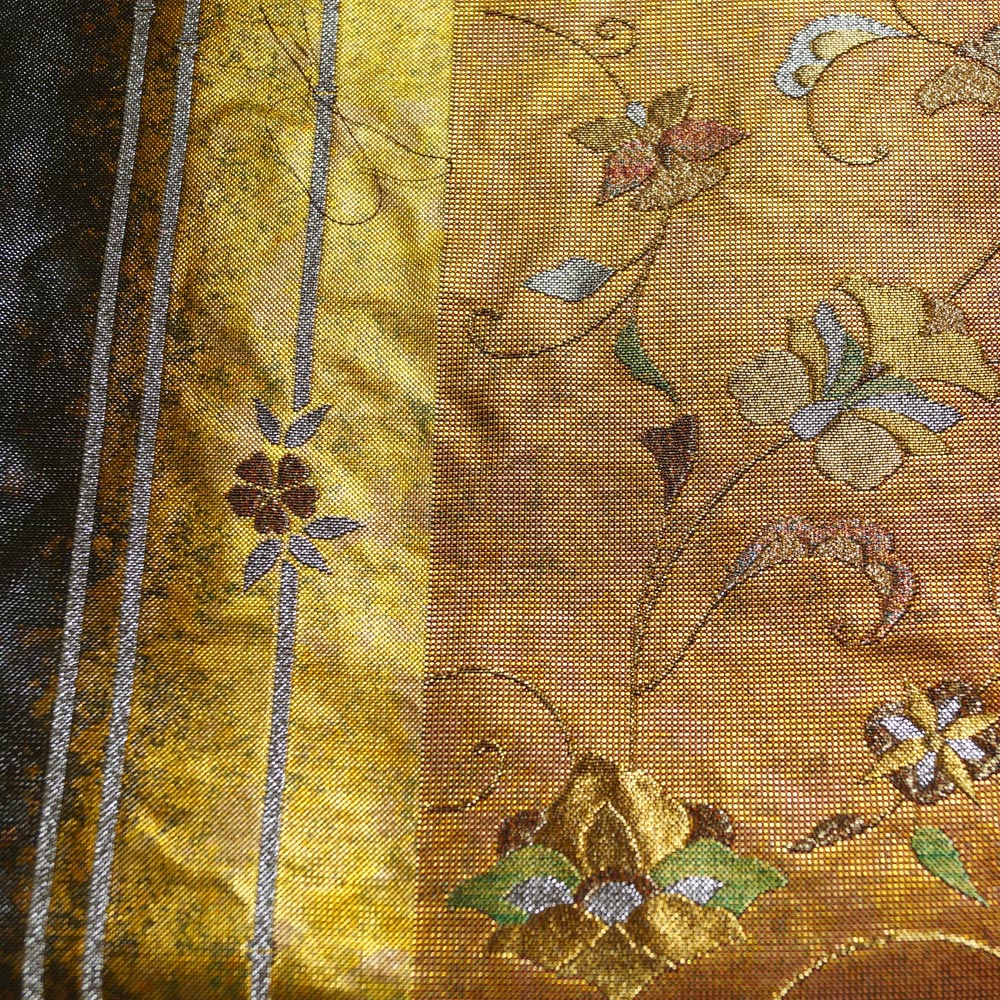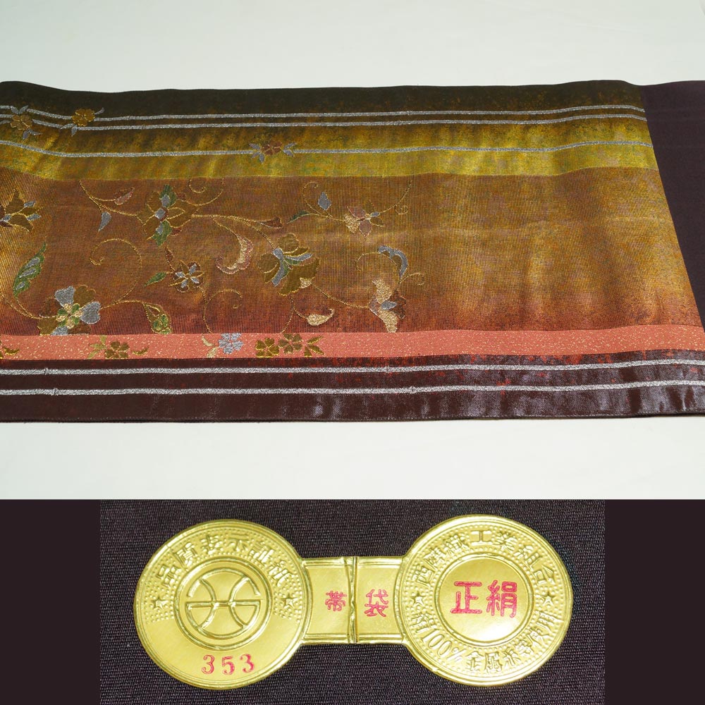| 商品 説明 | 干割れ模様の地織が施された正絹地を薄い明るめの芥子色系に染め上げた色無地と、金・銅色系ぼかしの地に縞に唐花模様が織られた袋帯の2点セットです。 お着物に家紋は入っておりません。帯は西陣高島織物謹製、西陣のメガネマークが余り布に付いております。 |