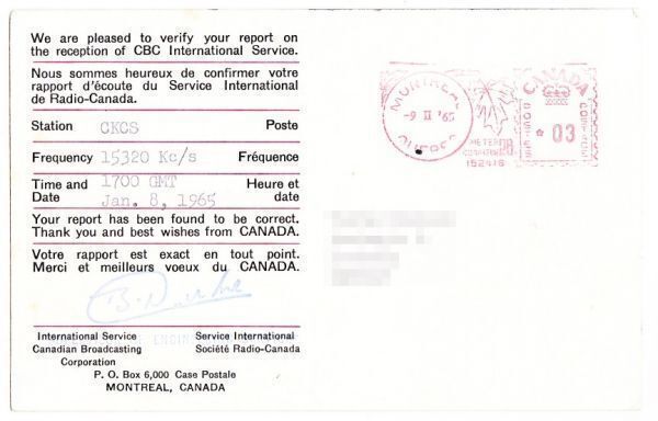 | 商品説明 | CBC International Service, CKCS のベリカードです。カード取得者の名前は出品上、画像から消してあります。 |
