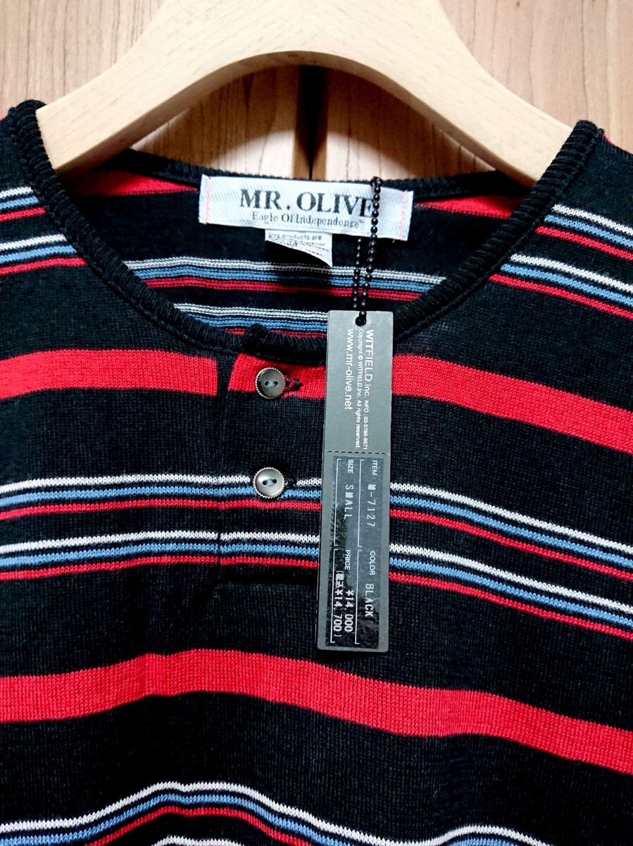 MR.OLIVEミスターオリーブのマルチボーダーヘンリーネックニットカットソーです。