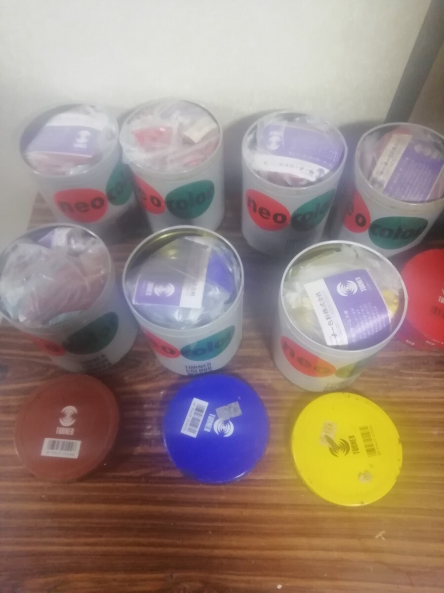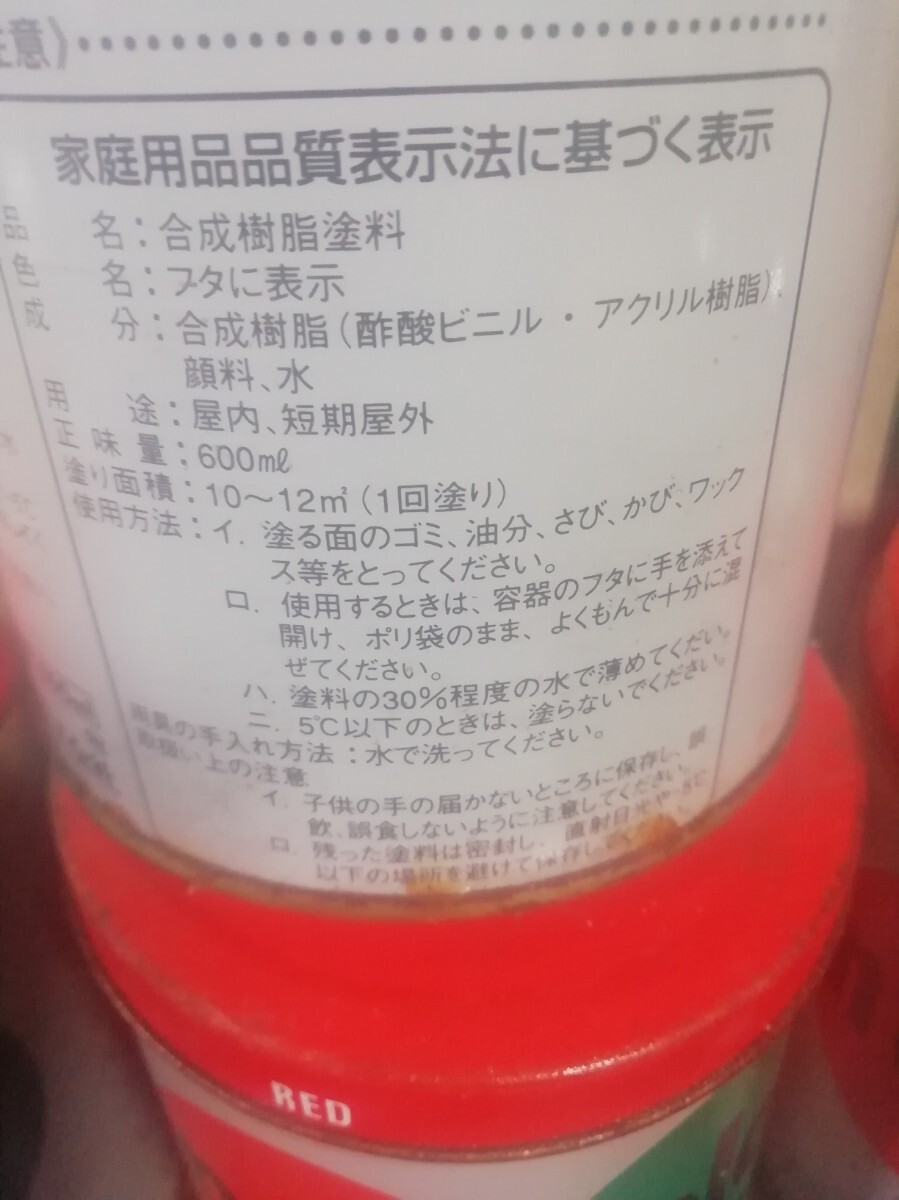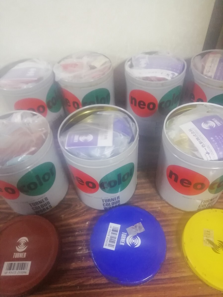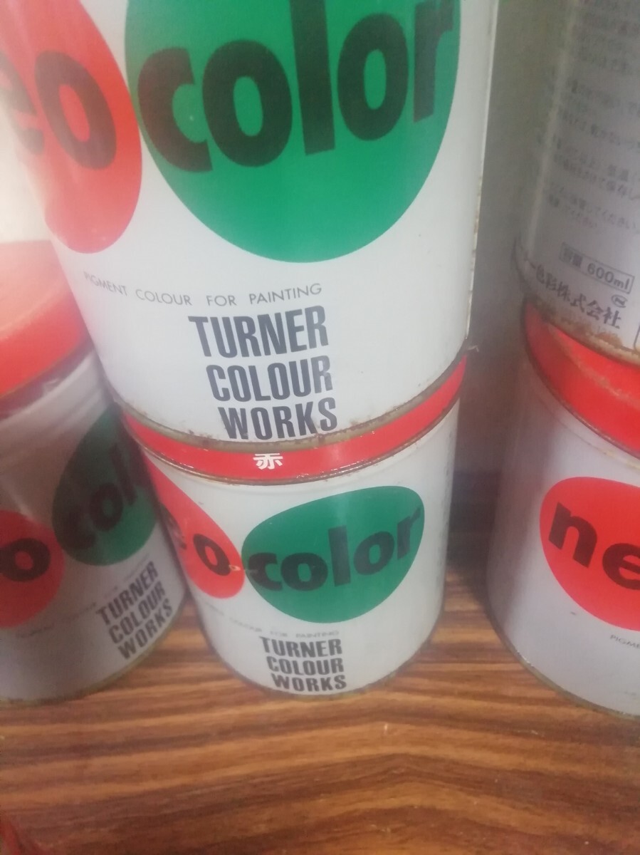 ターナー NEO カラー 600ml 赤 4缶 青 1缶 黄色1缶 茶色 1缶の7巻です外部用の耐水塗料で水星ですが乾いたら水に溶けたりすることはありません ポスター用の絵の具です 新品 価格 1700円ぐらいです