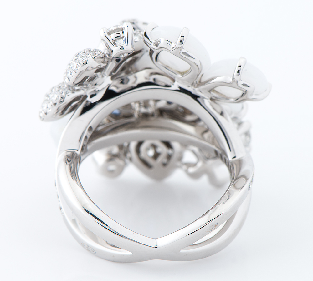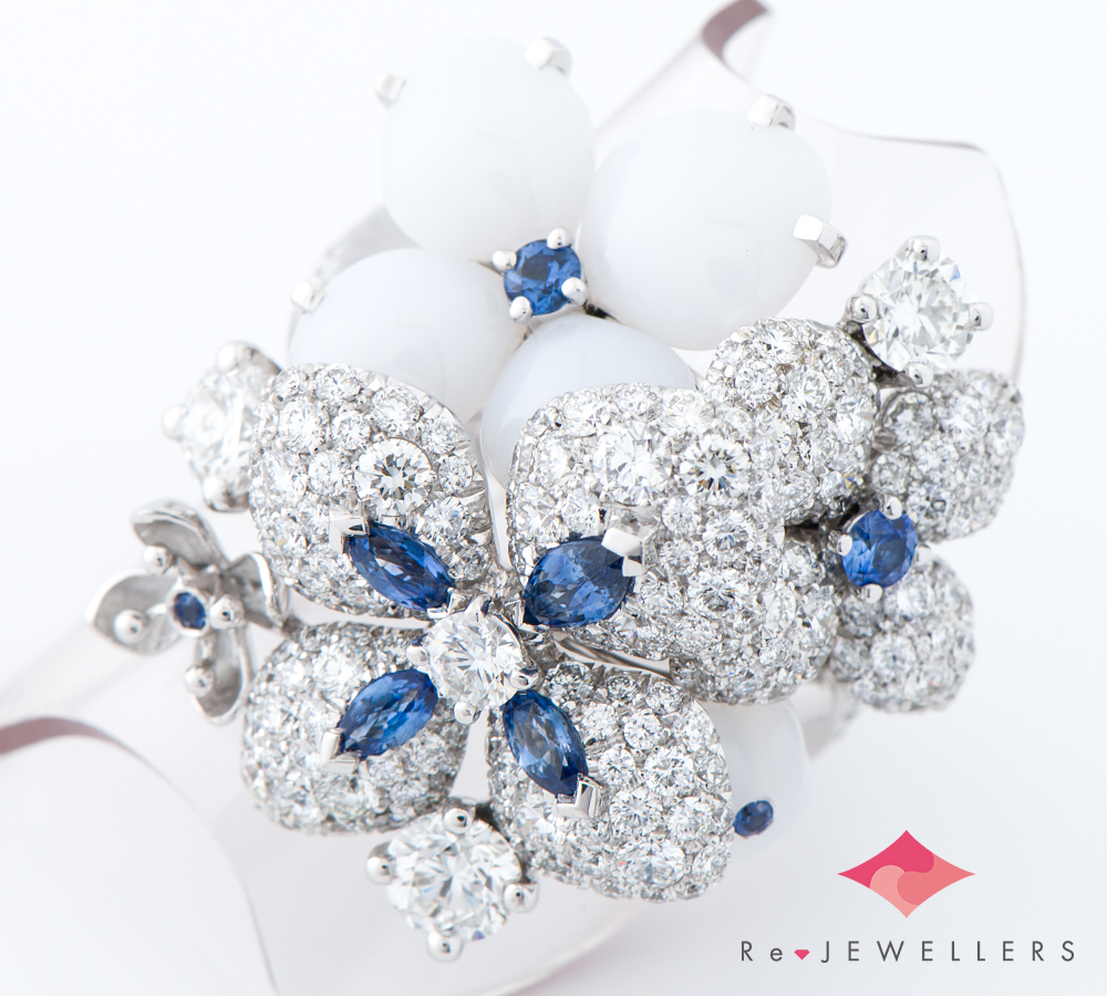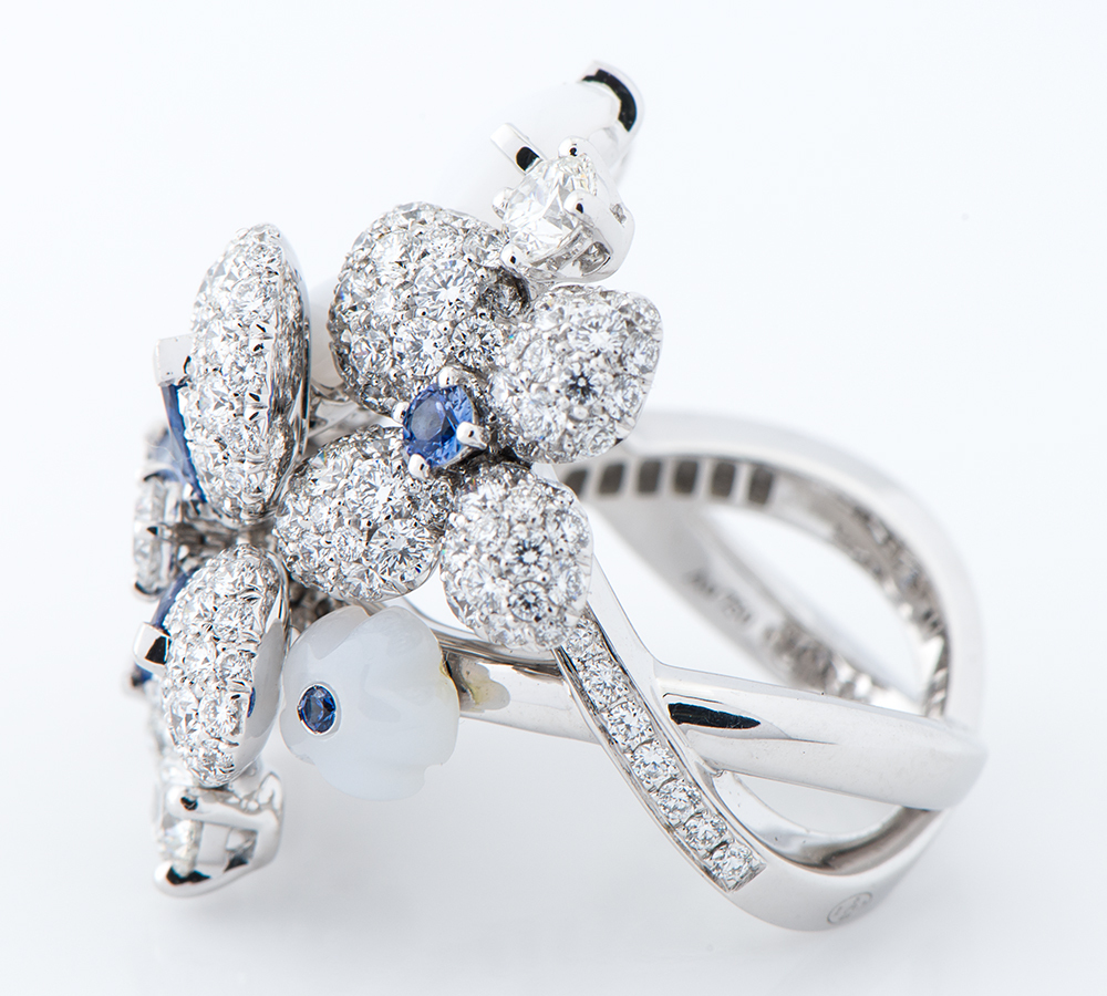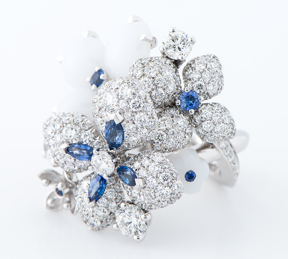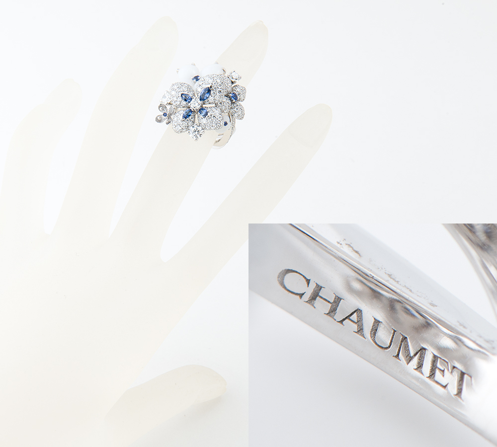 ショーメと縁の深いナポレオンの皇后ジョゼフィーヌが愛した庭園に植えられたことから、フランス語でアジサイを意味するオルタンシアをモチーフに作られたコレクション。艶やかなホワイトカルセドニーと、ダイヤモンドの質感の違いを組み合わせて表現された花々は、眩い煌めきが華やかな印象。ランダムにセットされた3石の良質なダイヤモンドや、花芯にセットされたマーキスシェイプのブルーサファイア、一輪一輪が美しく見える重なり具合など、全てにこだわりが詰まった素晴らしいデザインは、ただただ美しいの一言に尽きます。ショーメらしい独創性を感じさせる上品なハイジュエリーです。