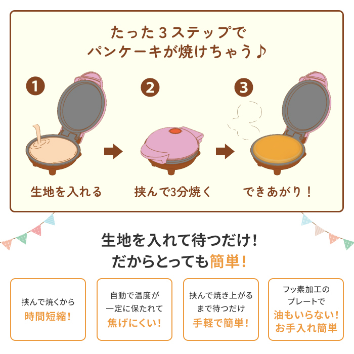 ◇手のひらサイズのプチパンケーキメーカー ◇直径10cmのプチパンケーキが約3分で作れます。 ◇上下の熱源でひっくり返さず時短調理。 ◇プレートはふっ素樹脂塗装でお手入れ簡単。 ◇お子様のおやつ、パーティーにおすすめ。 ◇お好み焼きやマドレーヌなども作れるかんたんレシピ付き。 ◇プレート固定式 |