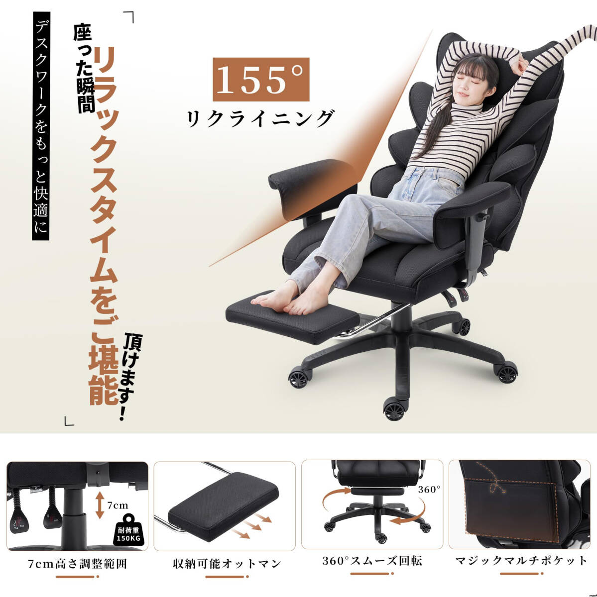 さらに、155度まで倒れるリクライニングや、上下調整可能なクッション付き肘掛け、収納式オットマンなど、細やかな調節機能も充実しています。