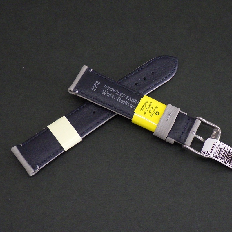 表面にはラバーコーティングを施したリサイクルポリエステル生地を使用し、裏地にはエコロリカを採用した環境への配慮と実用性を両立したモデル。根元に厚みを持たせつつ先端をフラットに仕上げたデザインで、幅広い時計に対応する汎用性の高さも魅力です。